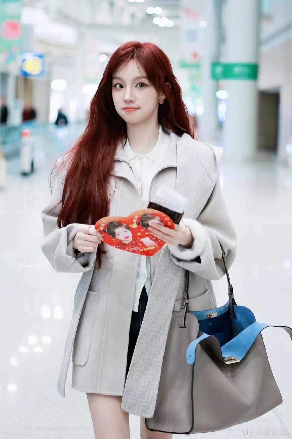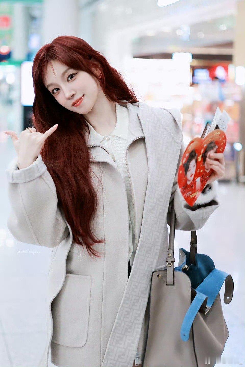 宋雨琦拿了自己的小福娃手幅米兰看秀出发日,宋雨琦机场接过粉丝手幅。手幅图案是可