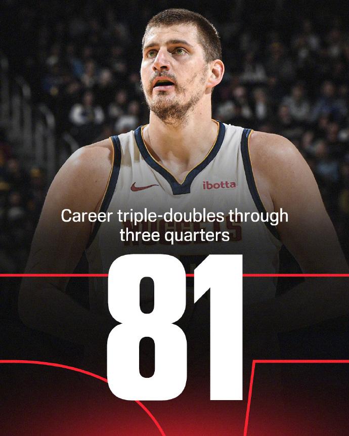 约基奇生涯第81次三节达成三双,历史第一! 在三双榜单上,约基奇已经拿到185次,位居历史第二,仅次于威少的207次。 更恐怖的是,约基奇拿三双的效率太高了。 21-22赛季,约基奇单赛季拿到19次三双 22-23赛季,约基奇的三双次数就到了29次 到了24-25赛季,约基奇三双次数直接飙升到34次! 本赛季至今,约基奇伤缺了16场比赛,只打了42场,就拿到了21次三双,三双概率50%! 这个拿三双的频率,实在有点非人类,只要正常再打个三五年,约基奇的生涯三双次数,会达到后人难以企及的高度,断档到300次,也是有可能的。 以后“三双王”的名头,该由约基奇来当了。