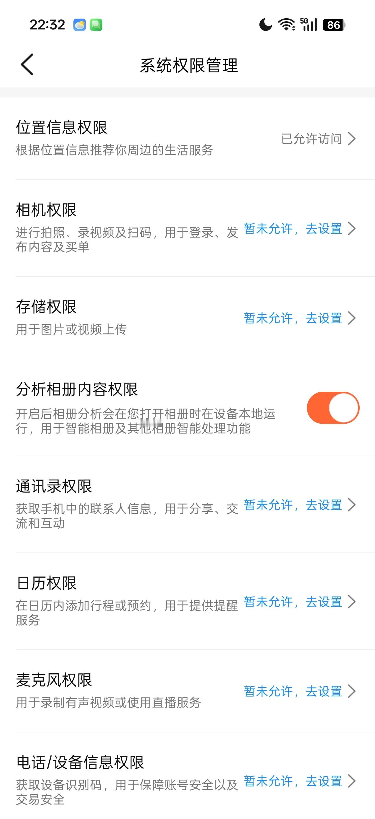 路径:APP,我的,右上角,设置,隐私管理,系统权限管理