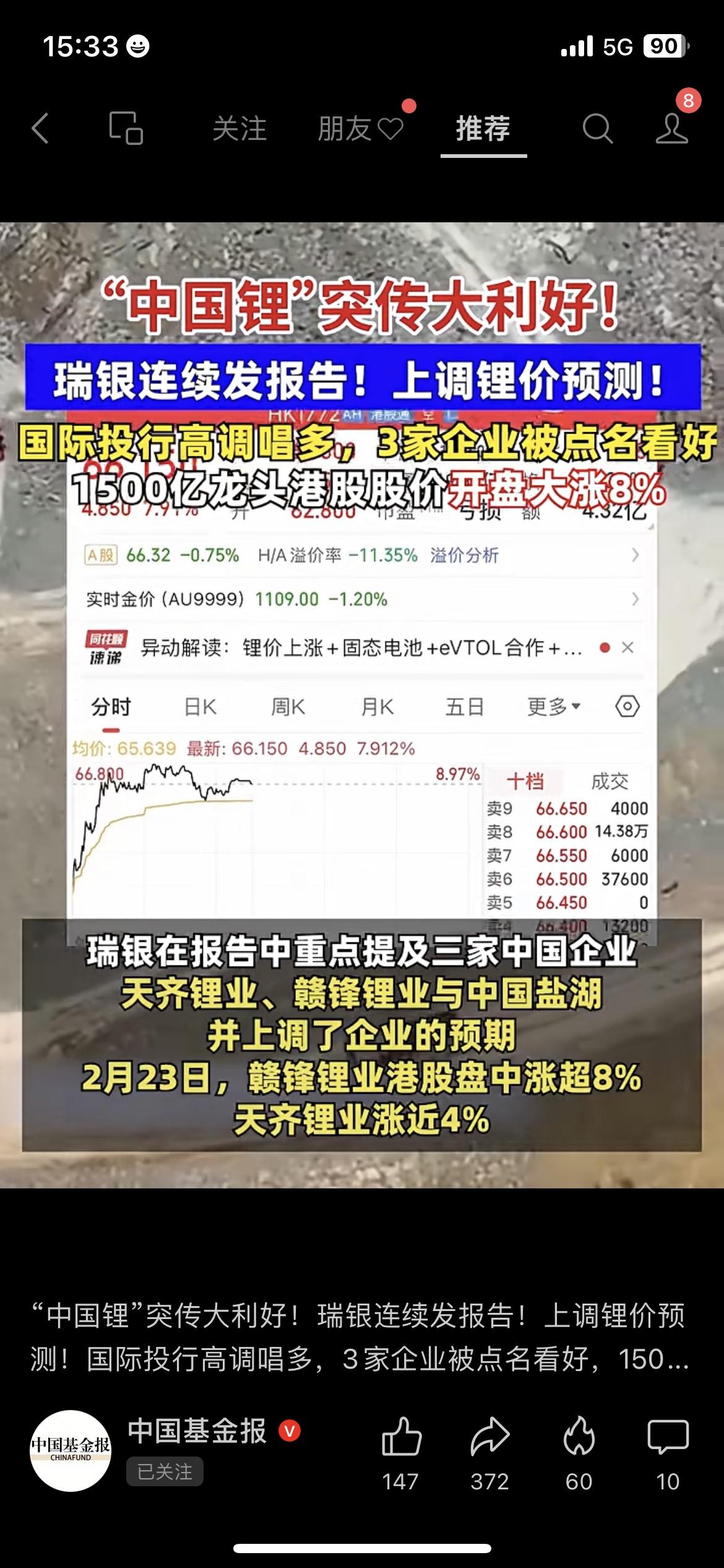 今天“中国锂”又火了 瑞银在春节期间接连发布报告,上调了锂价预测,还点名看好天齐锂业、赣锋锂业和中国盐湖这3家企业。 受此影响,赣锋锂业港股盘中涨超8%,天齐锂业也涨了近4%。 瑞银说,电动汽车已经接近实现业内所说的“三重平衡”,这个以前只停留在理论层面的目标,现在正在逐步成为现实。 说白了,就是电动汽车的成本、续航和安全性都达到了一个新的平衡点,这对锂矿企业来说,无疑是重大利好。 但咱普通人也别太激动,锂价波动很大,投资还是要谨慎。 市场有风险,投资需谨慎,不构成任何投资建议。 中国锂 瑞银 赣锋锂业 天齐锂业 电动汽车碳酸锂行情