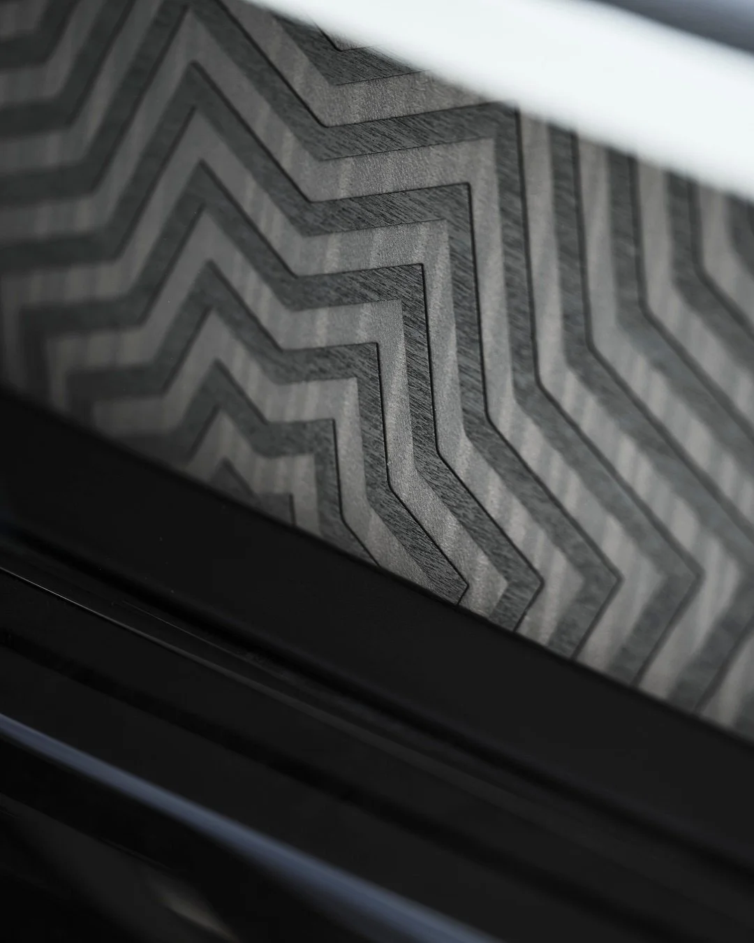 这项耗时五年研发的雕刻工艺汲取意大利刮花技法精髓。先在透明涂层下铺设深色底漆,再覆盖浅色表层,随后以激光雕刻出145-190微米深的几何纹样——其厚度略超单根发丝——从而显露出底层的对比色调。由此形成的立体纹理表面经手工打磨,呈现雕塑般的质感。