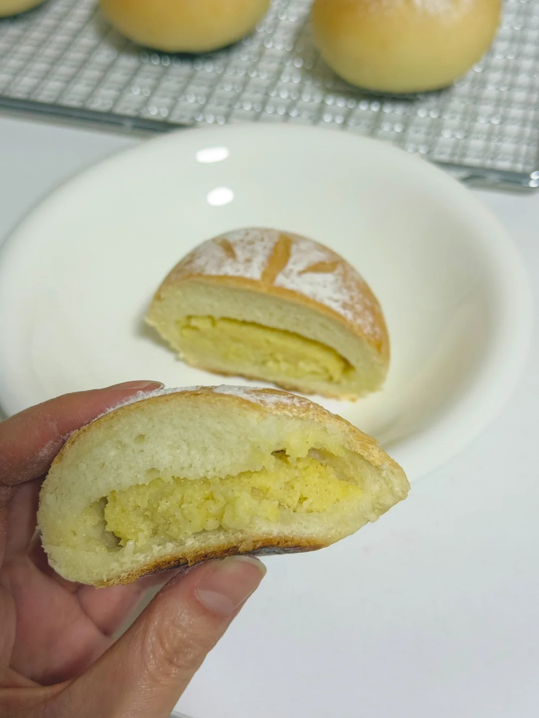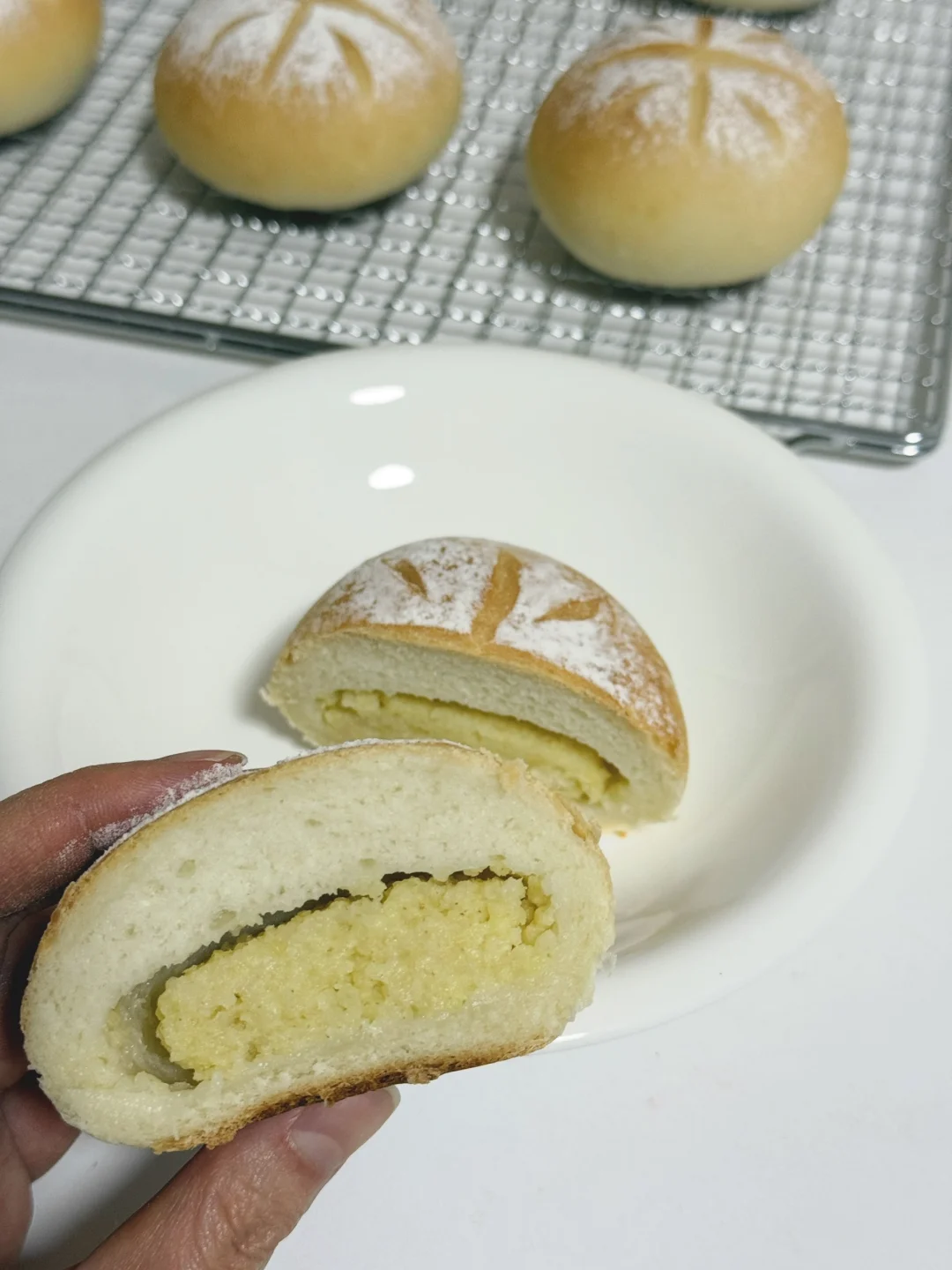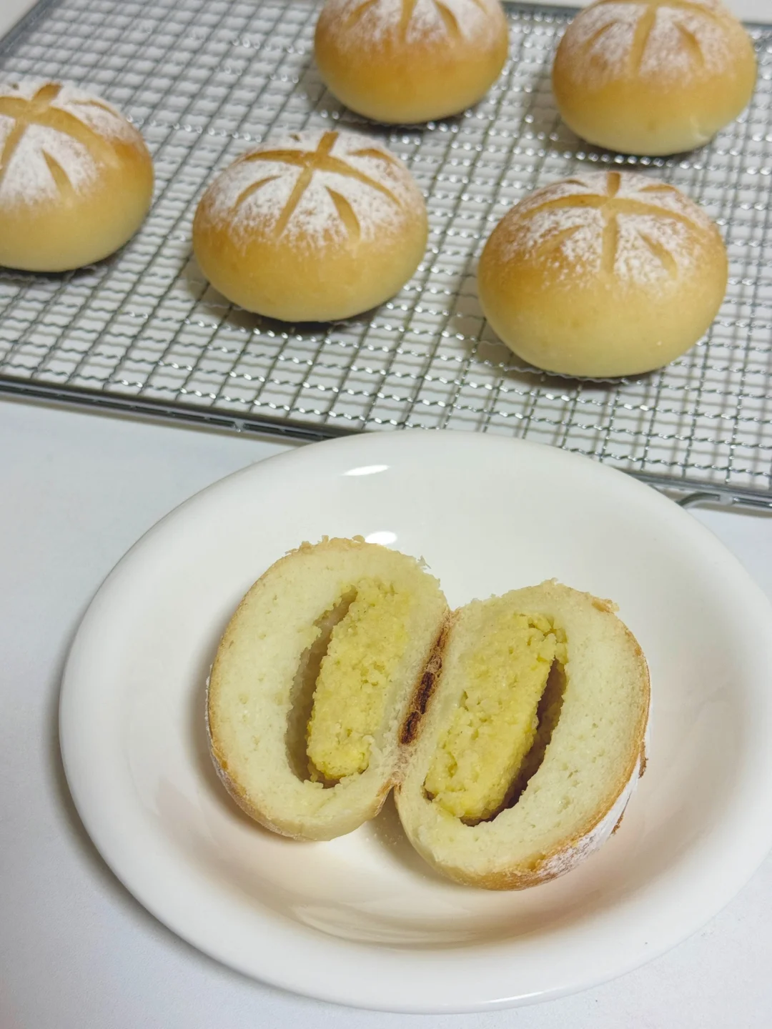 过完年做个清爽的小米面包吃吃吧~ 所需材料: 大米粉烫种:大米粉50克|开水70克 主面团:高筋粉200克|细砂糖25克|盐4克|冰水100克|耐高糖干酵母3克|无盐黄油12克|大米粉烫种全部 大黄米馅料:蒸熟大黄米200克|炼乳10克 👩🏻🍳厨师机揉面时间参考 3档3分钟成团 5档10分钟加黄油 3档3分钟黄油揉匀 5档8分钟面团揉好 🔥烘烤温度参考 平炉烤箱中层上火170°C 下火200°C 18分钟