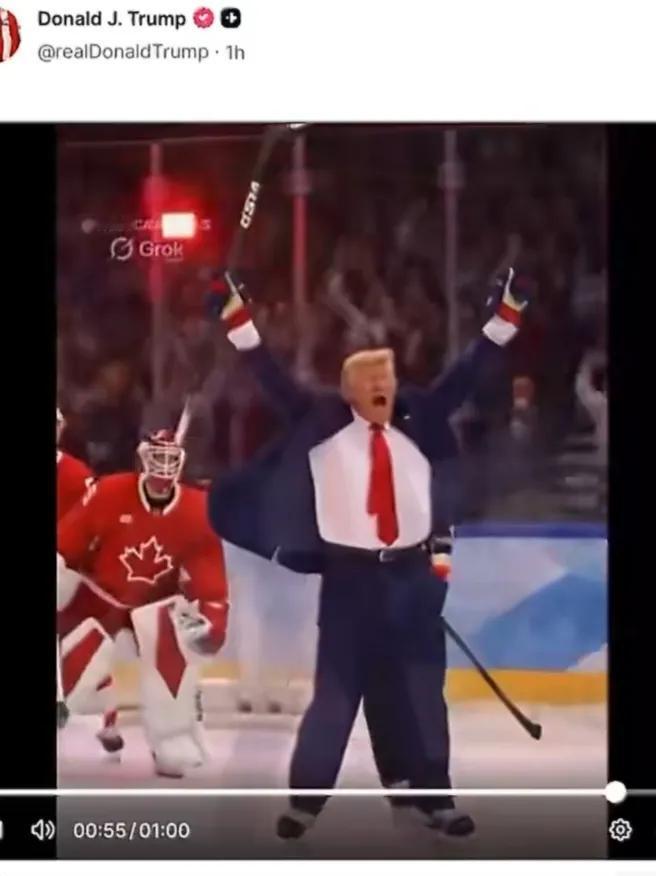 美国总统老特在社交媒体上发布了一段AI视频,内容是他率领美国冰球队和加拿大冰球队打决赛,他一个人大杀四方、所向披靡,撞翻一名加拿大冰球队员,并且殴打了一名加拿大冰球运动员,最终为美国队赢得了奥运会冰球比赛的金牌。 都没法说这老头了,太自恋也太流氓了。从这段AI视频就能看出,老特无视规则,大耍流氓。