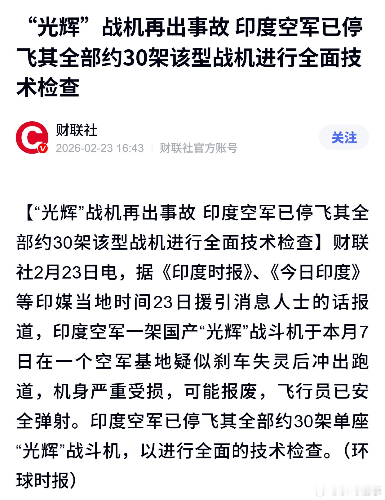 “光辉”战机再出事故 印度空军已停飞其全部约30架该型战机进行全面技术检查