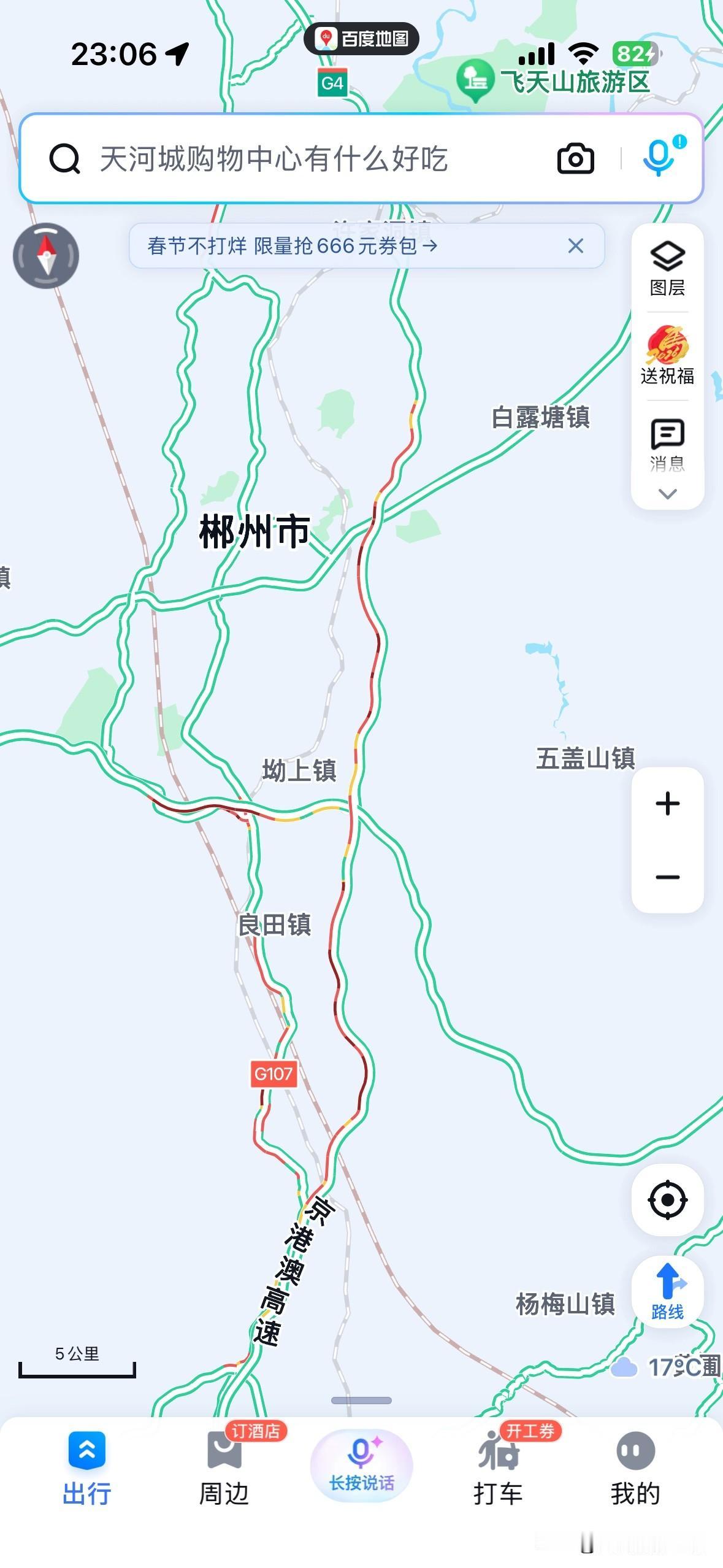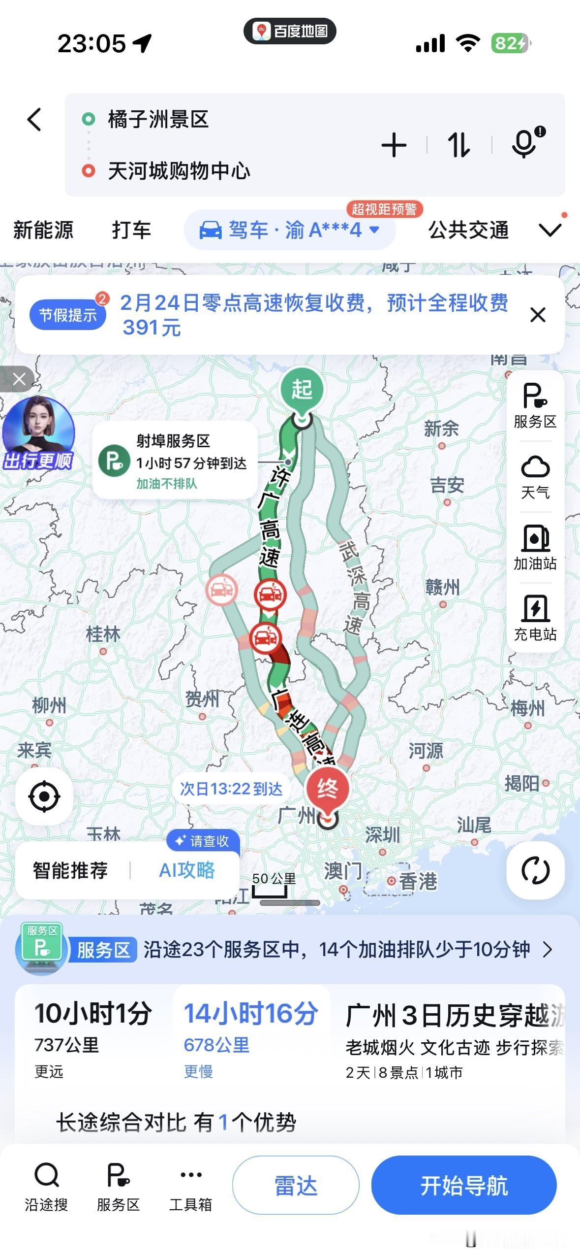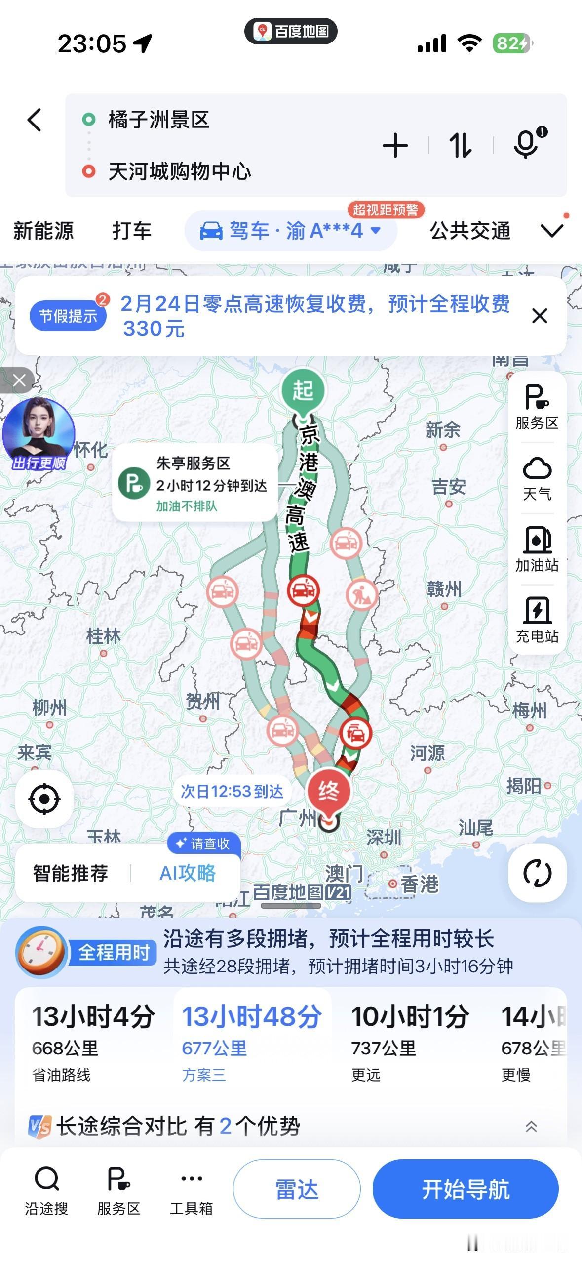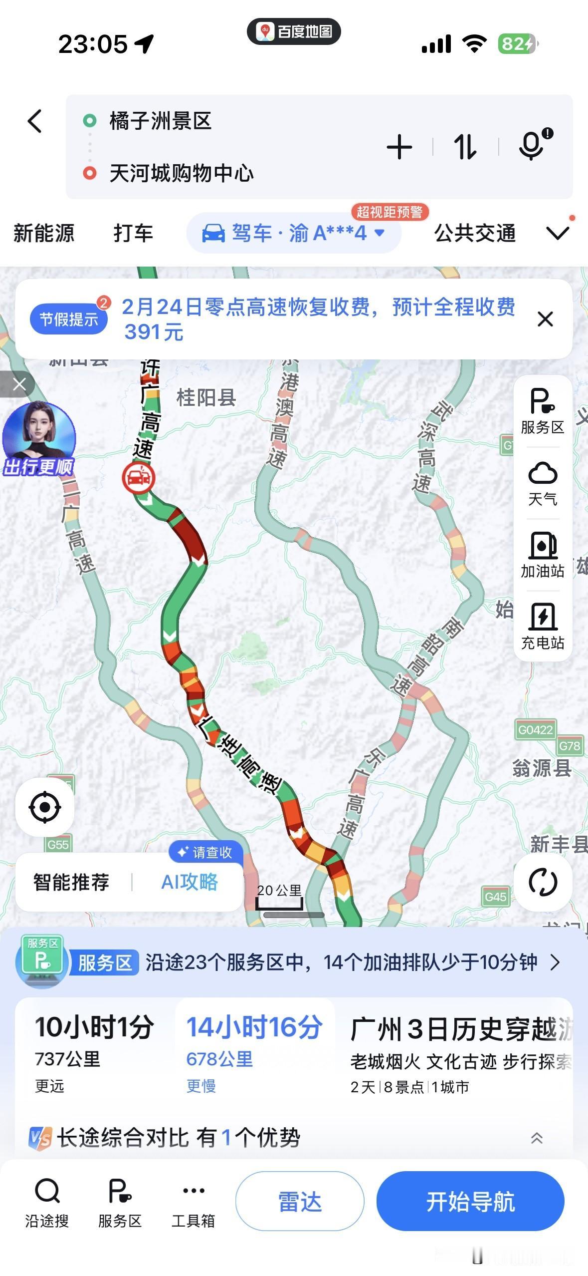 哎呀!2月23日晚上11点,京港澳高速公路,许广高速公路,依旧大堵车中!此时此刻,湖南省境内,还有大量车辆,距离广东好远!好吧,此时此刻,如果从湖南省长沙市出发,途径京港澳或者许广高速公路……自驾车到广州市,估计要耗时13-14个小时……也就是说,今晚11点出发,明天中午12点左右才能抵达广州! 好吧,今晚,这些还堵在湖南省境内的车辆,比如说,堵在郴州的,堵在蓝山县的……再过1个小时,接下来的里程就都是要缴纳高速公路过路费的啦! 没想到,今晚,居然有这么多车辆,要缴纳过路费!真是没想到! 半夜三更,还堵在湖南境内的车辆,心里真的是有一万匹马在奔跑吧! 大家觉得呢?!