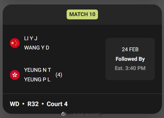 四号场第十场 女双 第一轮 李怡婧 王漪朵 VS 杨雅婷 杨霈霖 第十二场 男双 第一轮 梁伟铿 王昶 VS 钟鸿健 海卡尔