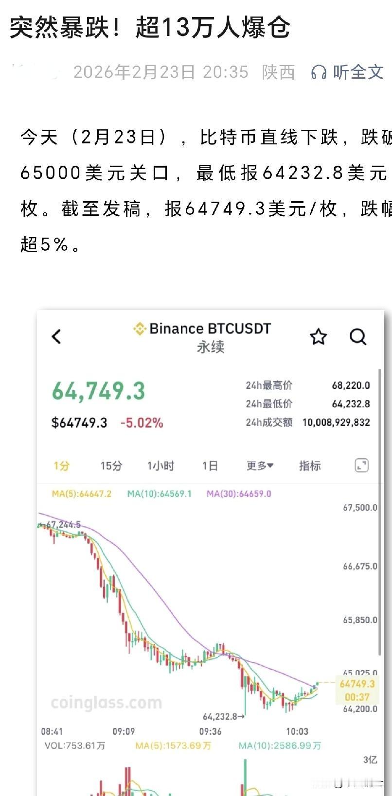 比特币崩盘是今年过年一个惊人的消息,现在看中国全面限制比特币金融交易是无比正确。2月23日,虚拟货币出现大幅震荡比特币交易一举跌破6.5万美元大关,下降达5%,有超过13万人直接爆仓。而其他虚拟货币也基本跌幅在6%以上。在2025年10月比特币的交易价格那可是12.6万美元的高位,这才不过是短短几个月时间降幅竟近半,看来以比特币为代表的虚拟货币还真是人类财富的收割机。 虚拟货币本身就有着脆弱的自身缺陷,在国际政治震荡带来了极大的风险,而高杠杆更是让这种风险无限放大。而且加密货币市场是7*24小时不间断交易,这让许多交易者在深夜还没来得及对交易震荡作出反应,可能就被平台强制平仓。 而我国在2021年就规定金融机构进行虚拟货币兑换、交易和代币发行融资都属于非法金融活动。而个人持有比特币进行交易、炒作不受法律保护。这些都直接堵死了比特币等虚拟货币在中国发展的道路,这也政策也保护了更多中国人的财富不会受到虚拟货币震荡带来的灰飞烟灭。