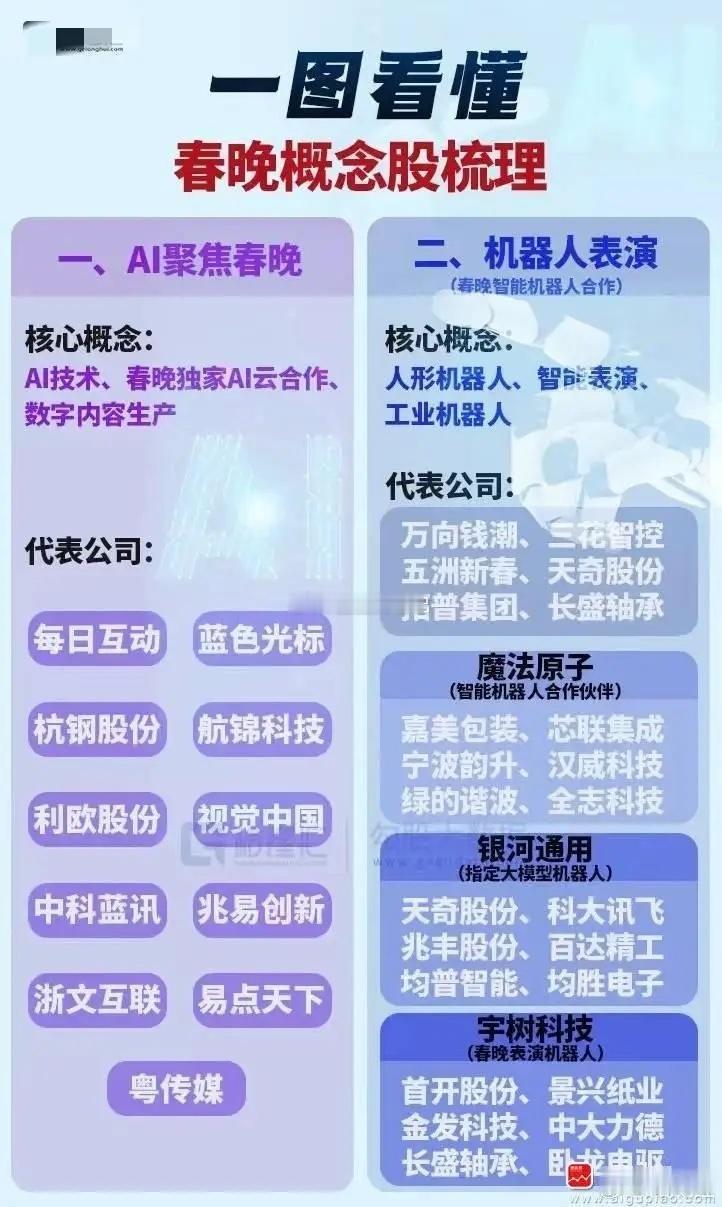 春晚概念股梳理!2026年央视春晚,是“AI”和“机器人”含量最高的一届!2026年央视马年春晚简直是“科技盛宴”,“AI”和“机器人”含量超高,也让相关概念股火了一把。AI方面,首次有独家AI云合作,字节跳动旗下火山引擎与豆包大模型提供全栈技术支持。像每日互动提供AI数据服务,蓝色光标参与AI营销与数字内容创作。机器人表演更是吸睛,被网友称为“含机量最高”的春晚。宇树科技携G1与H2人形机器人登台,完成全球首次全自主人形机器人集群武术表演,跑位速度达4m/s。这届春晚无疑是中国具身智能产业的“超级路演”,也让资本市场看到了人形机器人商业化落地的潜力。