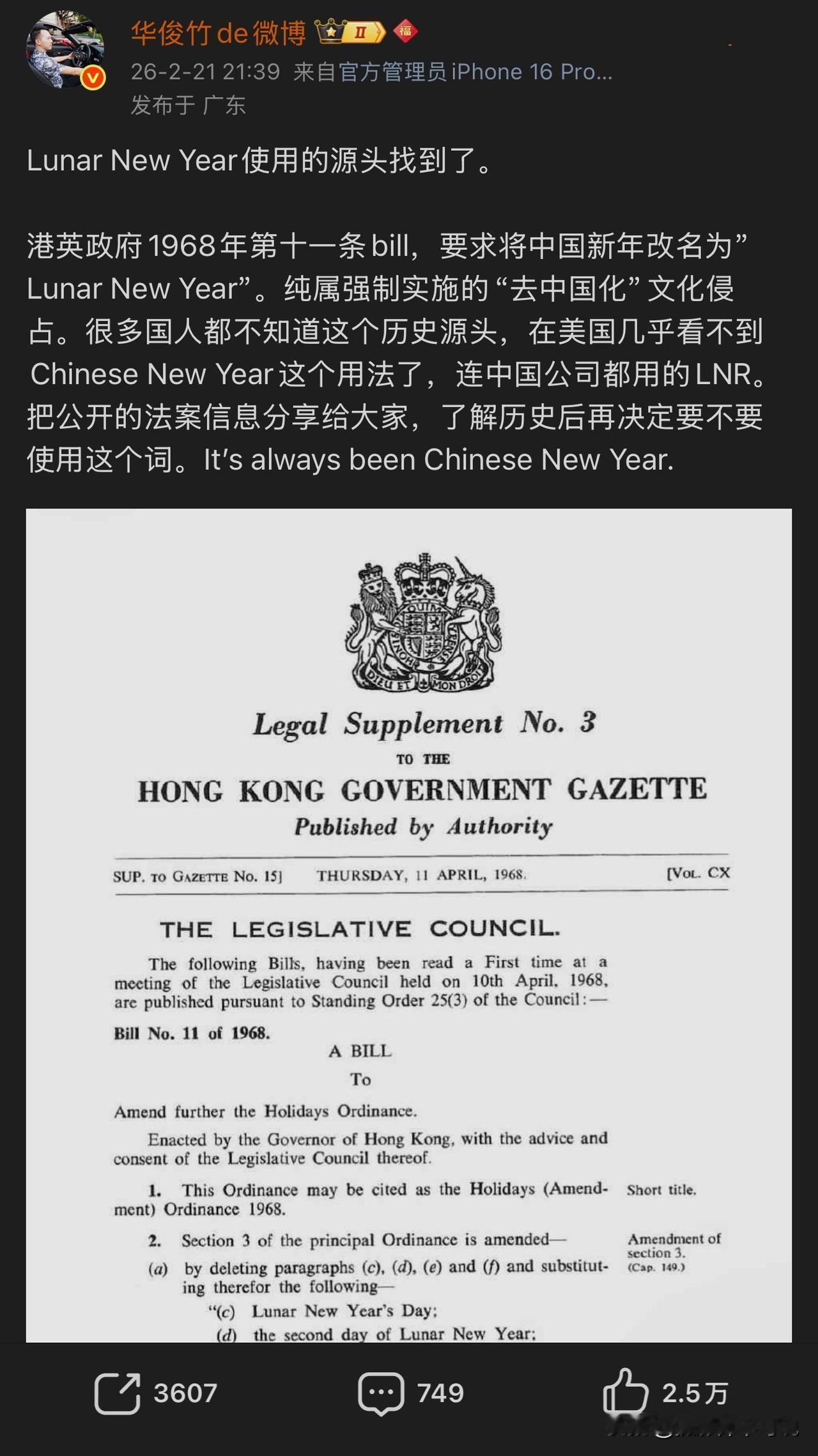 有网友宣称终于找到“Lunar New Year”的源头出处了,原来这个翻译疑似出自1968年港英政府的文件,要求将春节翻译为“Lunar New Year”,从此国际上就有很多人使用“Lunar New Year”来翻译我过春节了。再加上恰好又遇到了某个偷感十足的国家看上了春节,于是就一拍即合沆瀣一气了。由此看来,网友把日不落调侃为“搅屎棍”不是没有道理的!