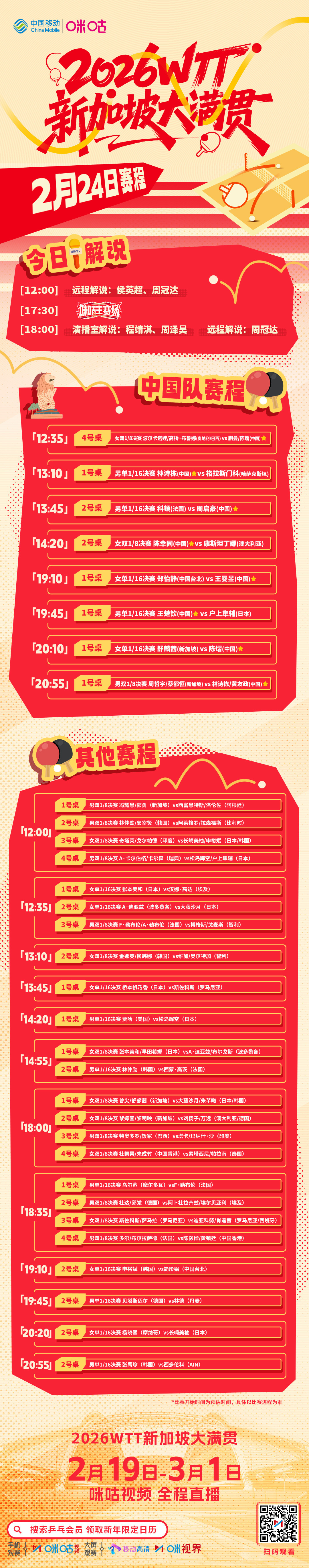 12:35 4号桌 女双1/8决赛 #蒯曼陈熠vs波尔卡诺娃高桥布鲁娜#13:10 1号桌 男单1/16决赛 #林诗栋vs格拉斯门科#13:45 2号桌 男单1/16决赛 周启豪vs科顿14:20 2号桌 女双1/8决赛 陈幸同vs 康斯坦丁娜
