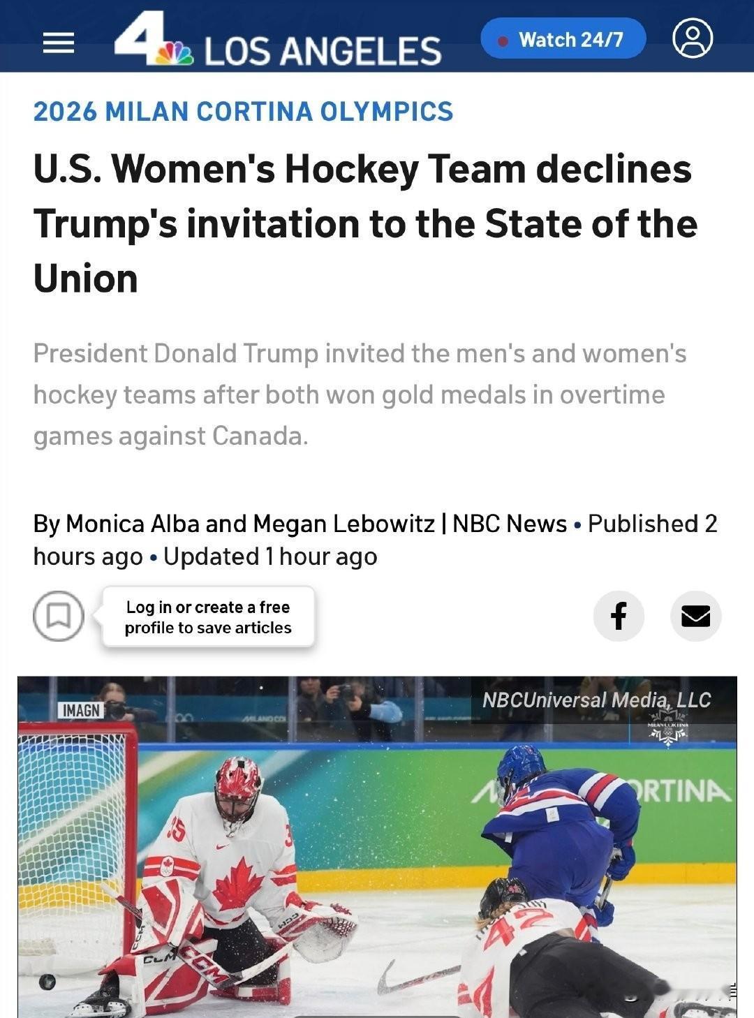 美国女子冰球队拒绝川普总统的国情咨文邀请。 美国总统唐纳德·川普在男子和女子冰球队都在加时赛中击败加拿大队夺得金牌后,向两队发出了邀请。