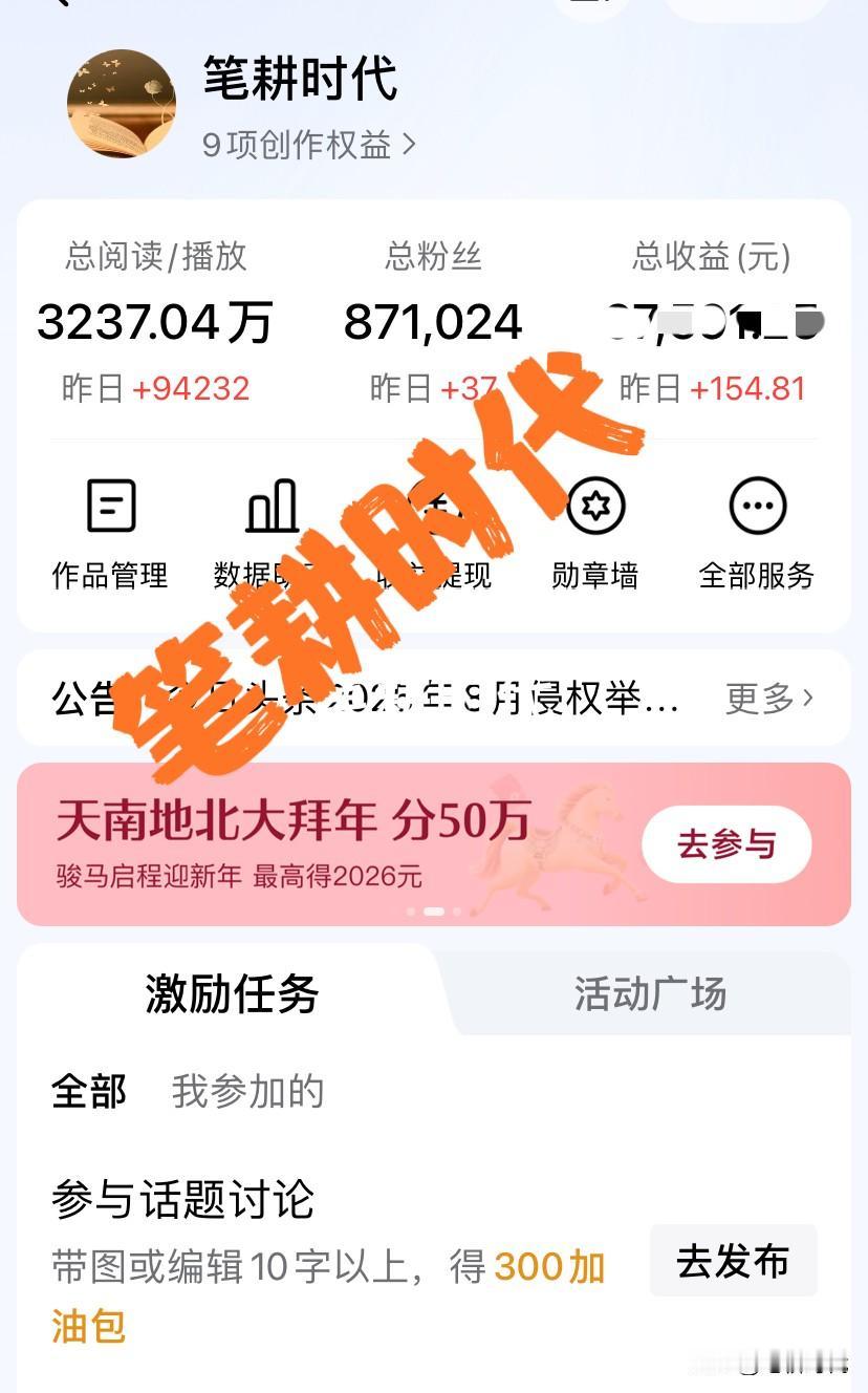 久违了!昨日头条收益突破三位数!并不起眼的数字却让我舒畅无比!去年这个时候那可是几千几百地赚,三位数字都不值得一提。 记得去年春节期间,几乎日更三篇文章,收益确实喜人,有一篇收益有4000多,几百就算低了。 看看今年春节期间的头条收益,用惨不忍睹来形容根本不为过。 我头条收益已经好几个月低迷了,要想日赚几千那简直是痴心妄想! 这个春节几乎每日在照顾得带状疱疹的老爸,忙里偷闲,为了不断更,只好以写微头条来敷衍。 对于收益也没之前那样激情了,已经长时间磨掉了,与自己和解了,坦然接受低得没边的收益。 昨日收益一出,9万多阅读量收益有150多块,哈哈,那个心情比日赚几千时都痛快! 因为太久违了 ,太难得了!