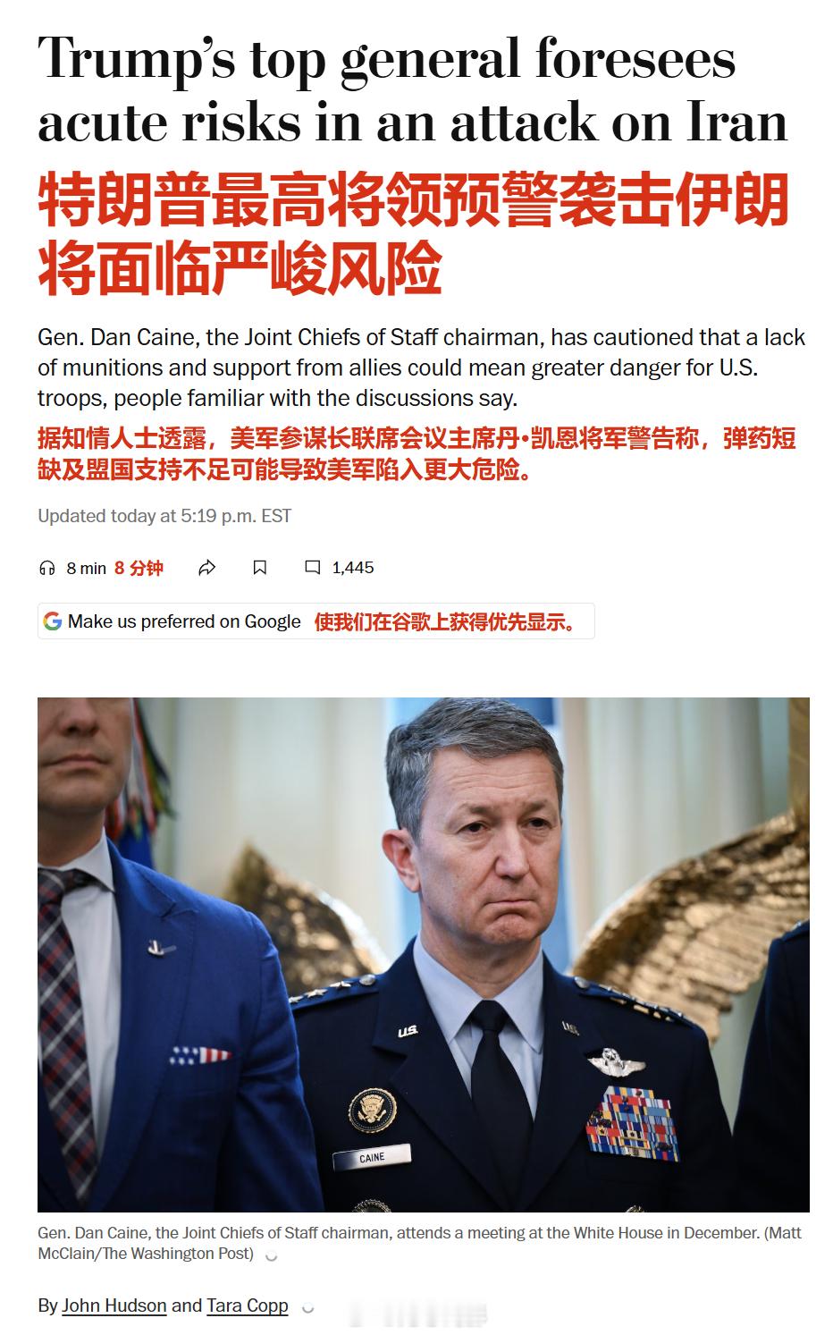美军五角大楼最高将领警告特朗普,不要对伊朗发动袭击,称关键弹药短缺以及盟友支持的缺乏将给行动和美国人员带来重大风险。