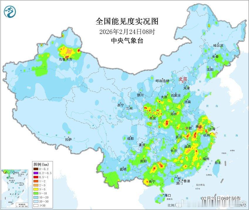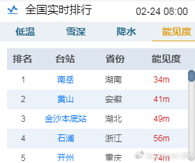 【雾和沙尘】今天早晨,有些零散的大雾出现。有的是雨后湿度大,有些是雨雾混杂。8时能见度,湖南南岳34米、安徽黄山41米、湖北金沙49米,均出现特强浓雾。浙江石浦56米、重庆开州74米、河南南召76米、贵州万山87米、江西庐山91米,出现强浓雾。上述站点也是各省市08时能见度最差的站点。