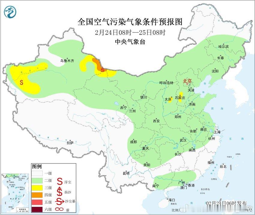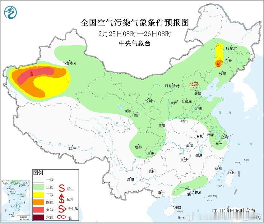 从今晨空气质量看,大多为优良。之前的沙尘影响结束。今明2天在新疆塔里木盆地西部还有一些沙尘。另外25日因为低空南风较强,在科尔沁沙地可能起沙,导致内蒙古通辽、吉林白城、松原、四平一带,可能出现短暂的扬沙。