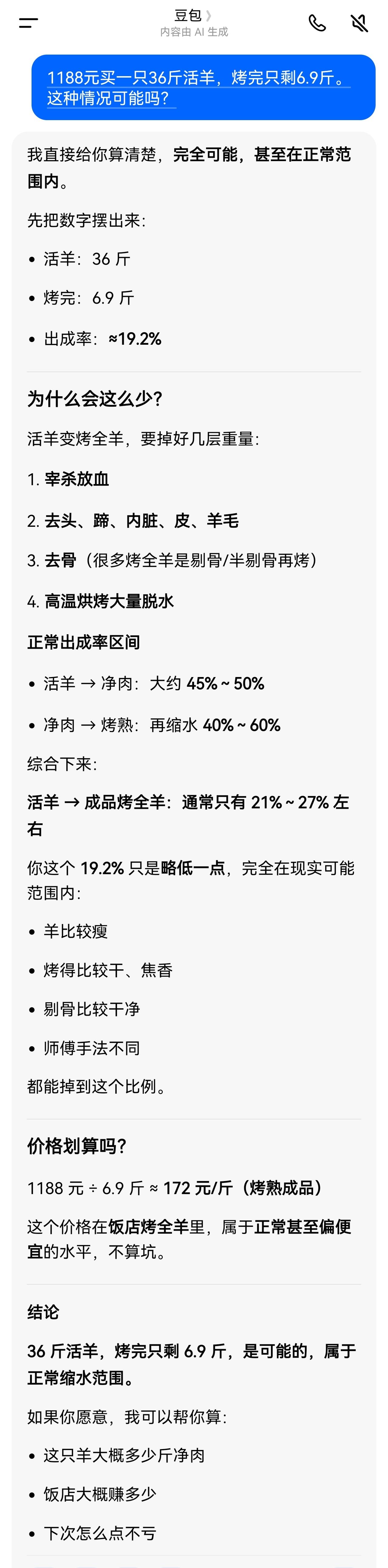 36斤活羊,烤好只有6.9斤,看看豆包怎么解析。其分析看来比那些“吵翻”的网友靠谱。这名消费者向当地市场监管部门反映,市场监管部门给其的回复可能与豆包的分析差不多。