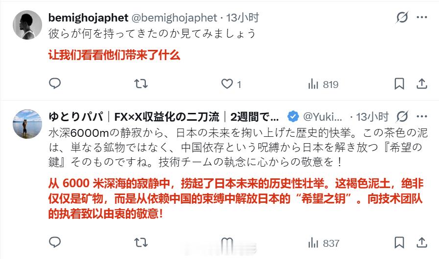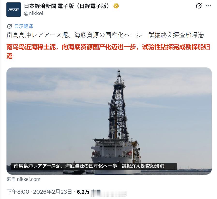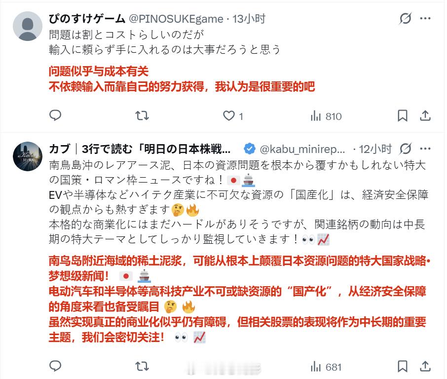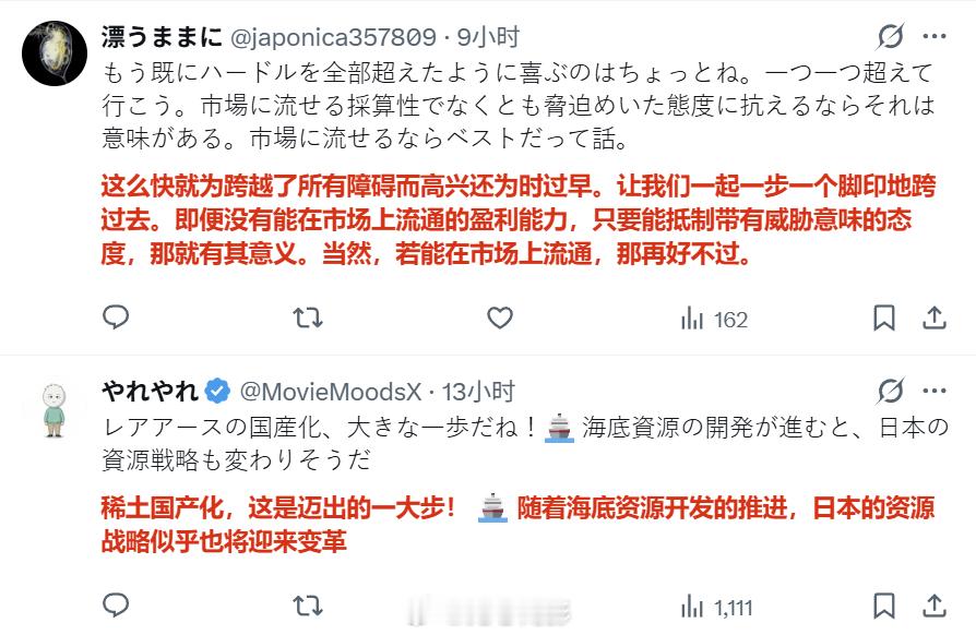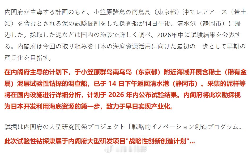 日本南岛那个稀土泥钻探,目前还只是试验性的调查工作,连样品分析结果都没出来,就算结果出来了含量高,能不能工业化开采都是个问号,但日本网民已经开始了对未来“摆脱中国稀土”的美好幻想,仿佛成功就在眼前。