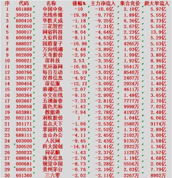 2月24日开盘45分钟,主力“卖出的 ”30名单! 中国中免:主力净流出 10.6亿元 光线传媒:主力净流出 9.77亿元 华胜天成:主力净流出 9.25亿元 三花智控:主力净流出 7.31亿元 网宿科技:主力净流出 4.64亿元