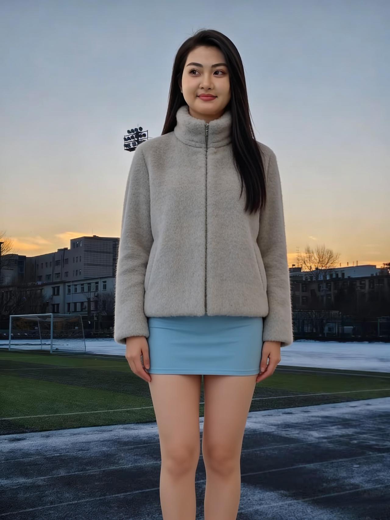 雪还在檐角悬着, 风把最后一片云揉碎, 你站在操场的跑道上, 像一捧刚从晨光里取出的暖。 ~ 浅灰的绒衣裹着颈间的软, 天蓝短裙却敢吻着霜的边缘, 长发垂落,是未被惊扰的墨色, 眼波里盛着半片未融的霞。 ~ 有人在远处踢着空门, 你却把整个冬天的冷, 都穿成了自己的背景。