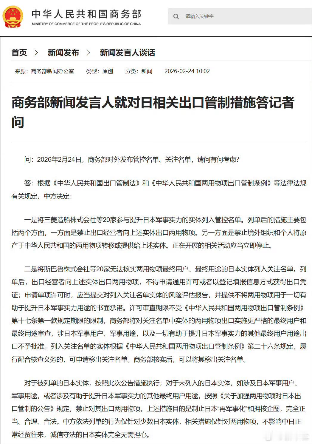 开工第一天,商务部:20家日本实体列入出口管制管控名单。
