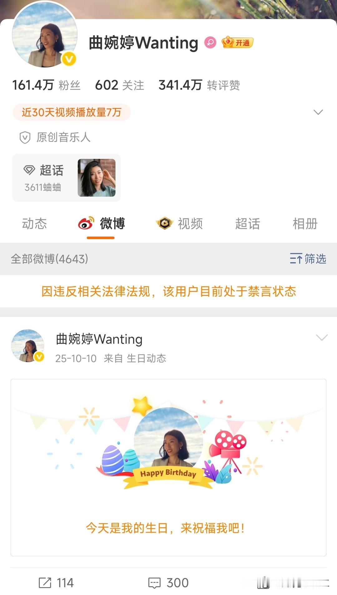 曲婉婷微博账号被禁言了,违反相关法律法规。 看了一眼竟然还有161万粉丝,去年发了生日动态,还有一个明星超话。