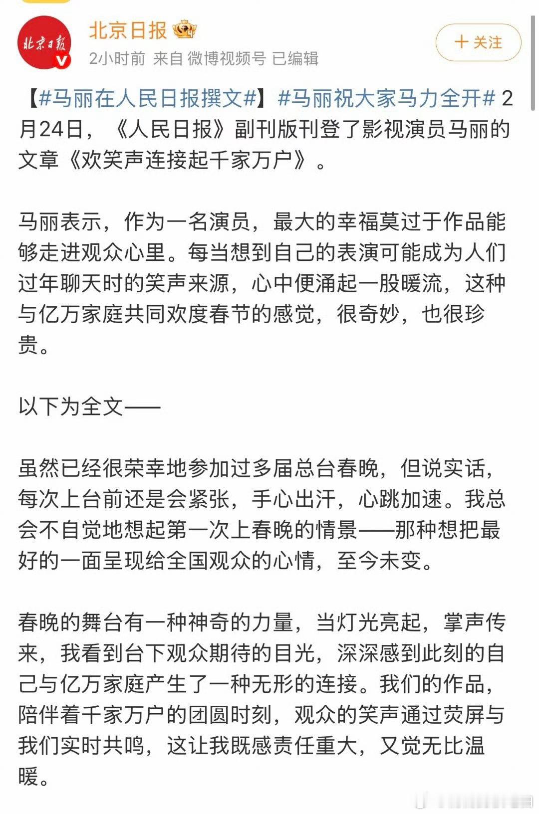马丽在人民日报撰文马丽祝大家马力全开 登人民日报的马丽好暖心!谈春晚的责任、电影的成长,字里行间是对观众的珍视,开工祝福马力全开超应景~