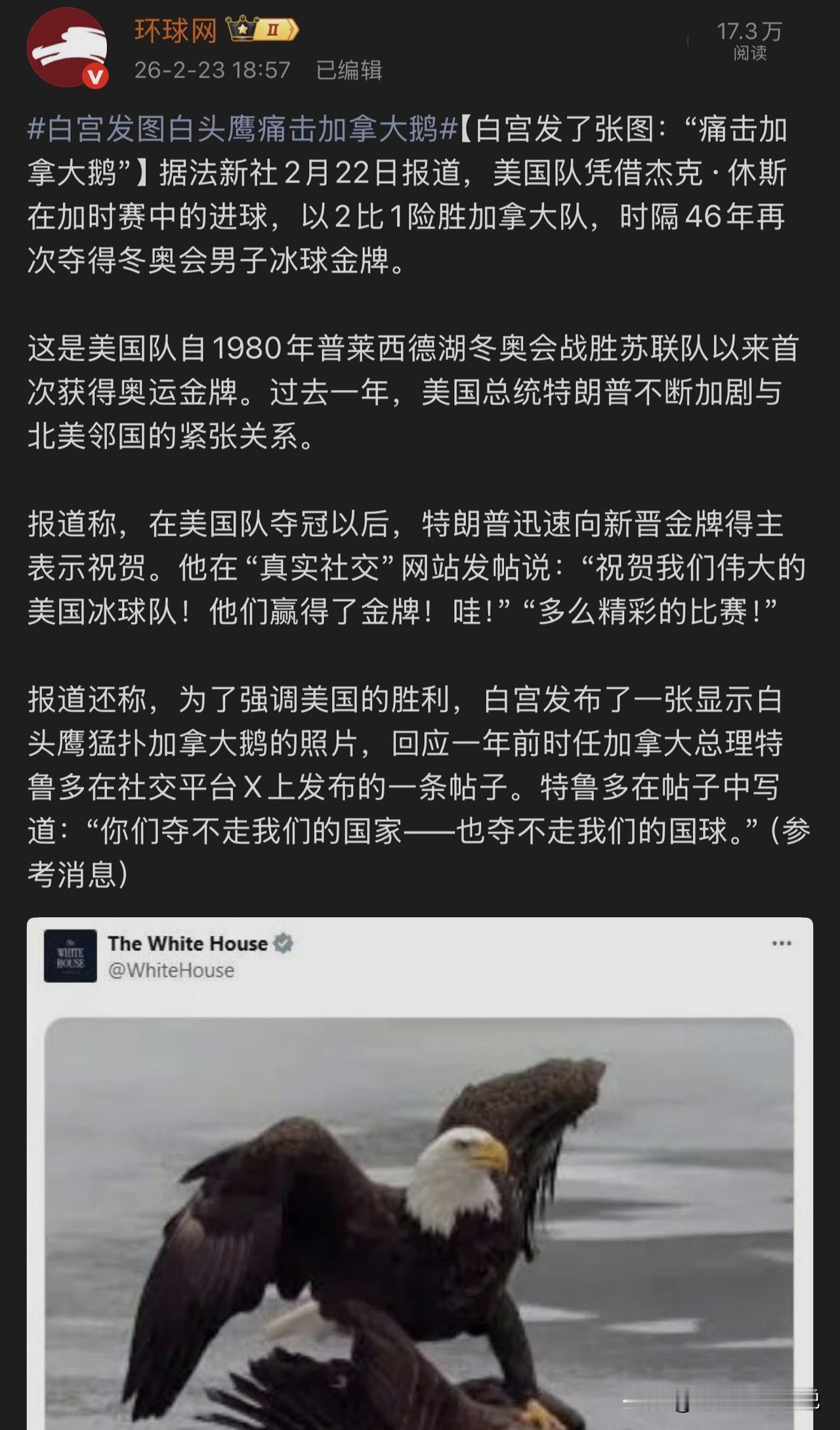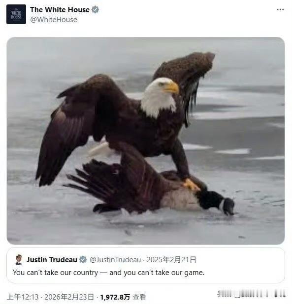 白宫就跟小孩子一样,居然通过玩儿图梗的方式来给加拿大上眼药。就在当地时间昨天,美国白宫在其官推上发了一张北美白头鹰脚踩痛殴加拿大鹅的图片。图片上白头鹰威风凛凛、神骏不凡,而被踩在脚下的鹅却狼狈不堪处于溺水状态!表面上看这张图梗起因是前两天在男子冰球赛上美国队险胜加拿大,这张图的意思很应景。但如果把眼光往前翻一翻,你会发现美国对加拿大都不太像盟友该做的。不但惦记人家的经济,还时刻琢磨着让人家成为一个州。总觉得美国这些年像极了幼儿园时期的我和同桌,做事说话总是那么孩子气!记录我的2026