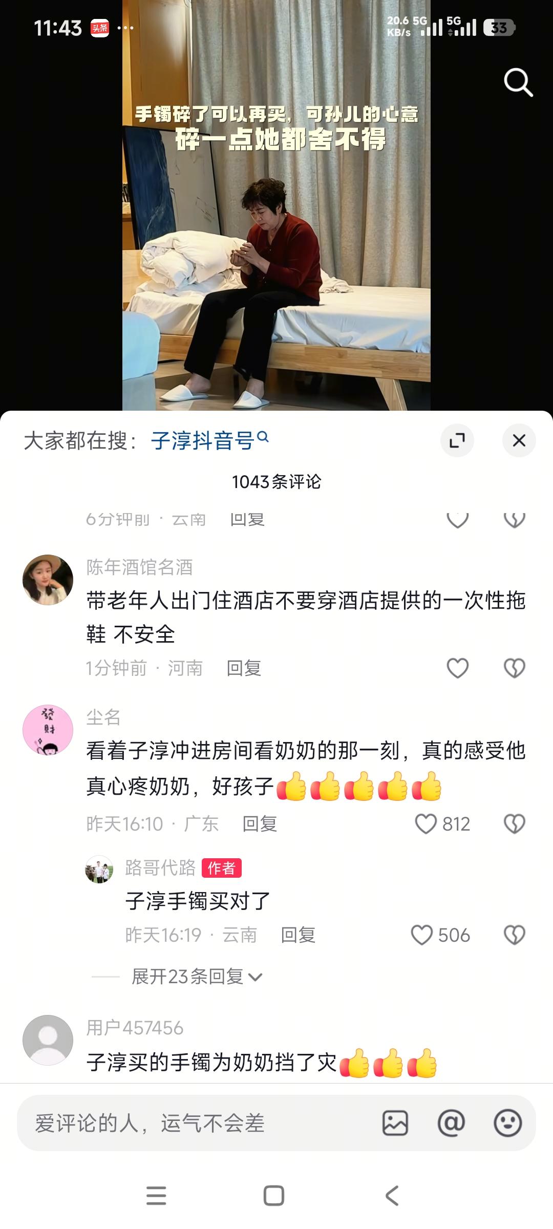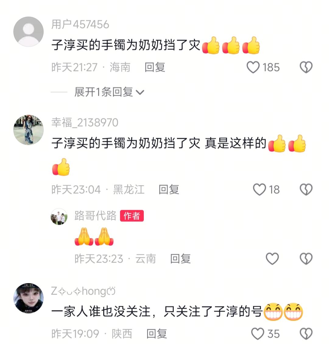 我预料到了路哥的妈妈,之前摔过一次,可能会再次摔 也预料到了,就算摔了应该也没事吧,因为还有子妍在身边 可万万没想到,竟然摔碎了子淳给的玉镯子,可能就是破财挡灾吧,真的服了 刷到路哥路嫂视频,直接给我整懵了!老人在厨房摔得哐当一声,我心直接提到嗓子眼,结果看完整个视频,比起碎掉的玉镯,最戳人的居然是一家人的反应,真的越看越有感触。 说实话,看到老人摔倒那一段我真的郁闷坏了,本来想直接划走,结果眼睛就挪不开了。我晕,好在孙女子研就在旁边,立马冲进去把奶奶扶起来,第一时间就给路哥打电话,这反应也太给力了吧! 然后路哥和子淳赶过来,围着老人确认了半天,确定人没事才彻底放下心。结果奶奶对着子淳一个劲道歉,说把他送的玉镯摔碎了,子淳立马安慰说“没事,这镯子是给您挡灾了”,我和小伙伴都惊呆了,这小孩也太会说话了吧!说真的,之前我外婆也在家摔过一次,戴了十几年的银镯子直接摔变形,人一点事没有,那时候我还没当回事,现在想想真的有点说不清的感觉。 视频发出来之后,评论区直接炸了。不是吧?好多网友都在提醒,短时间内摔了两次,一定要多注意老人的防滑,宾馆的拖鞋湿了真的很容易滑,还有人说这就是镯子挡灾了,碎碎平安。 路哥也专门回复了网友,说已经带老人检查过了,身体没问题,谢谢大家的关心。之前听别人说,陪在身边久了的物件,会替你扛过本该落到身上的祸事,以前我还觉得荒谬,现在看,或许是吧?反正人没事就是最完美的结果,对吧? 总之,我想说的是,家里有老人的,真的要多注意地面防滑,拖鞋换防滑款,地上有水及时擦,别等出事了才后悔。至于镯子碎了这事,信不信的都随便,人平安才是顶重要的,你们说对吧?