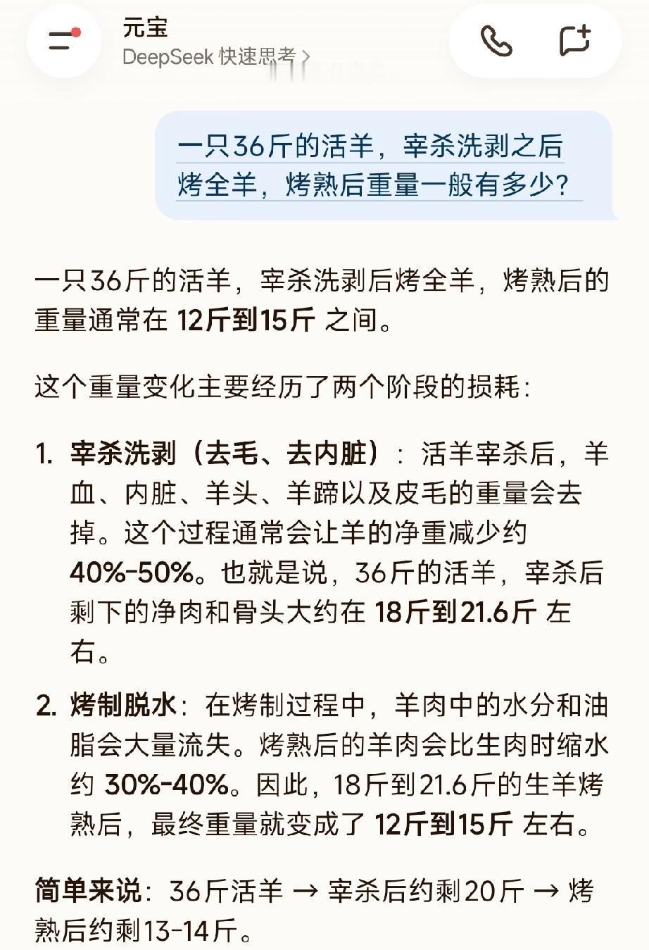 “商家称一只36斤活羊烤完剩6.9斤是正常的”。 幸亏现在有ai,不然我真的相信了。 不管是用豆包还是元宝,正常36斤的羊烤完起码要剩12斤以上,现在才剩6.9斤,那偏的也太离谱了吧? 而有关部门也迅速给出了答案,原来是注水羊。