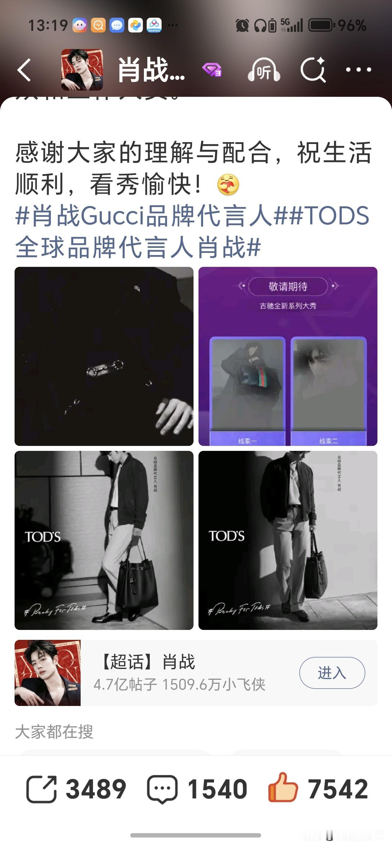 Gucci和TOD'S官宣肖战2月27日即将参加米兰时装大秀,巨星就要闪耀全球了,期待