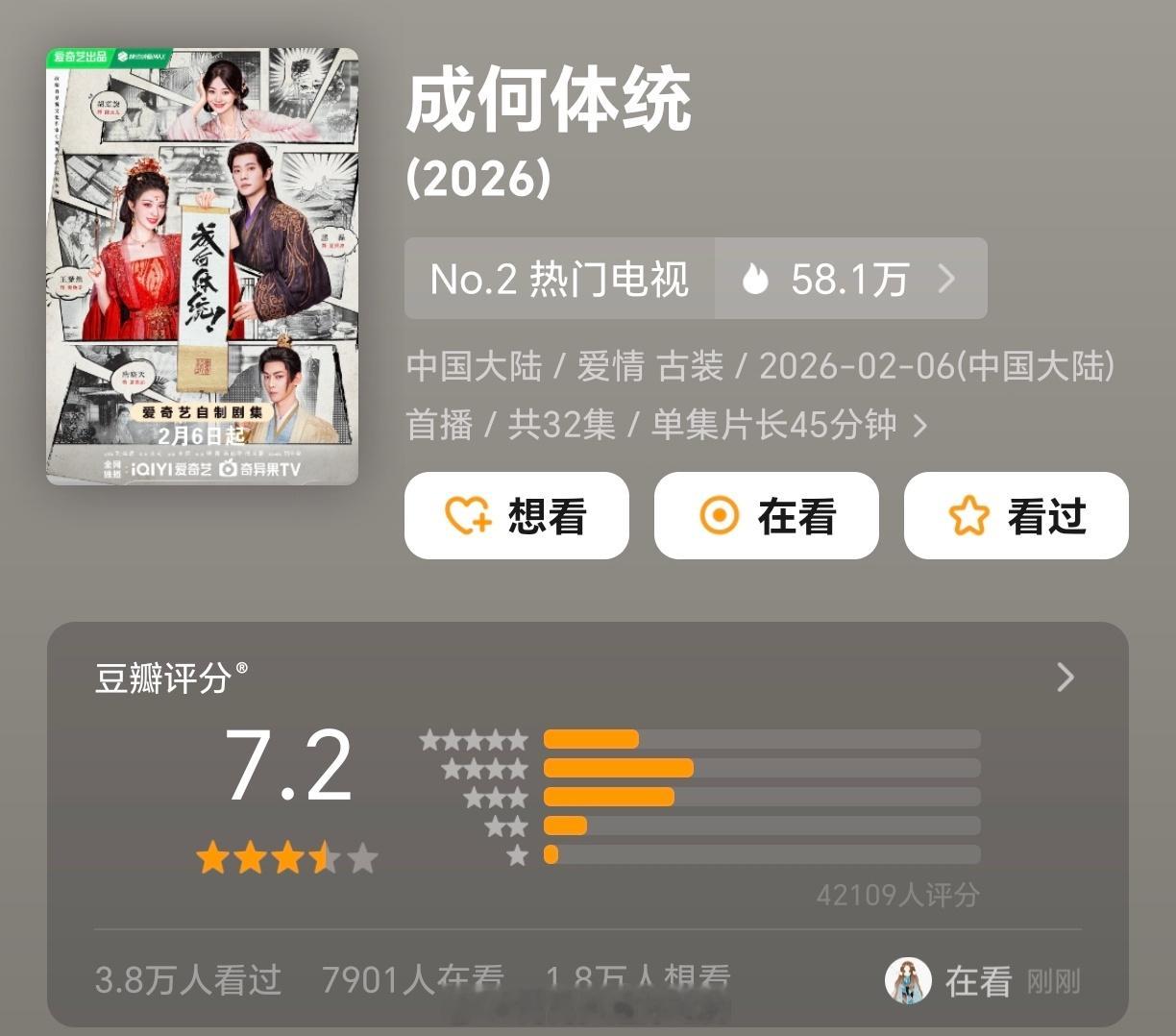 王楚然丞磊《成何体统》豆瓣开分7.2周围朋友看的很开心,古偶这个分数很不错了