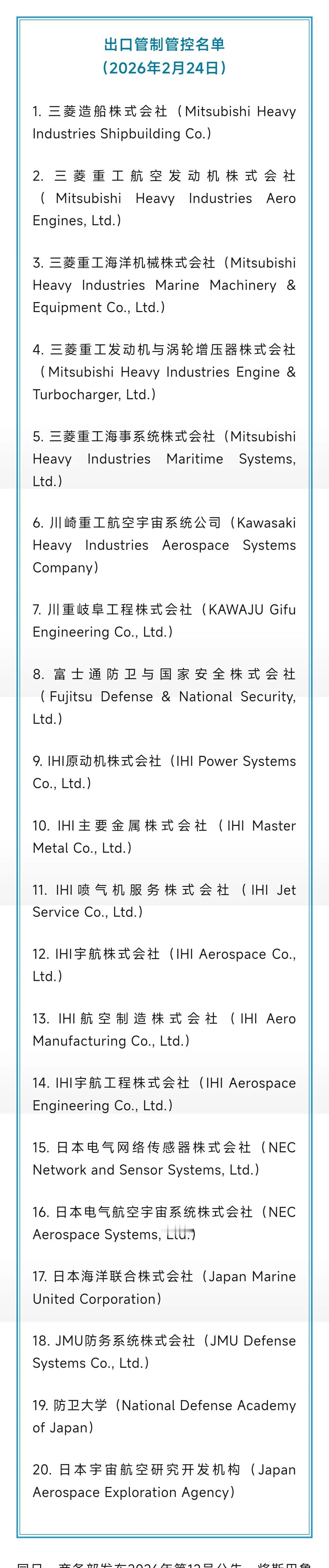 今天(2月24日)上午10:33分,当高市早苗错误地认为中国希望她下台,并用解散议会重新选举并再次成为日本首相,来表明日本人支持她对抗中国,中国就应该接受她的恶劣言论时;就在她再次当选后有些得意地还在了无新意地讲着“中国是重要邻国……需要沟通”的时候,商务部发布针对日本的最新制裁:“将20家日本实体列入管制管控名单”。 话说的很直接:“为维护国家安全和利益,履行防扩散等国际义务,将三菱造船株式会社等参与提升日本军事实力的20家日本实体列入管制管控名单,并采取以下措施: 一,禁止出口经营者向上述20家实体(图3)出口两用物项,禁止境外组织和个人将原产于中华人民共和国的两用物项转移或提供给上述20家实体;正在开展的相关活动应当立即停止。 二,特殊情况下确需要出口的,出口经营者应当向商务部提出申请。 本公告自公布之日起正式实施” 新的针对日本的管制管控,是在履行遏制日本军国主义复活的承诺,针对的是高市早苗在上周五(20日)当选后在国会演讲中警告称,中国的胁迫“日益加剧,并承诺改变国防战略,放宽对军事出口的限制”的狂言妄语,现在,商务部两用物项管制管控将对其影城有力遏制。