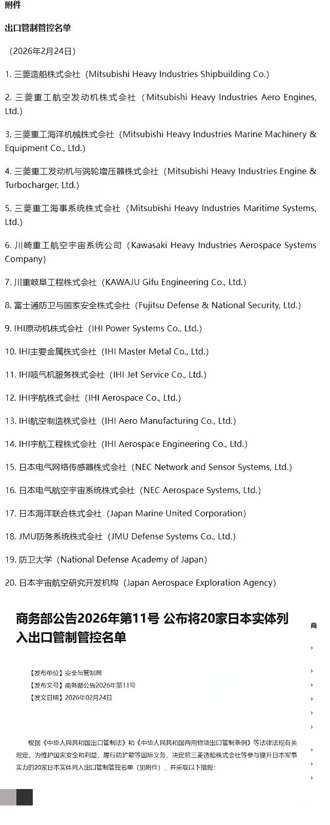 初八正式上班第一天,中国果断出手,日本再遇精准反制,中国商务部公告2026年第11号文件,决定将20家日本实体列入出口管制管控名单,通过这20家日本实体企业的性质不难发现,这些都是能够帮助日本提升军事实力的企业,所以中国此时出台11号文件,就是对于日本加速修宪扩军的一次有力回应。 这份公告不是临时决定,而是依据《中华人民共和国出口管制法》《两用物项出口管制条例》作出的合法举措,目标明确、执行坚决,没有任何商量余地。被列入名单的20家日本实体,覆盖船舶制造、航空航天、国防电子、军事科研等关键领域,是日本军工产业链的核心环节,它们的生产研发直接服务于日本防卫力量升级,与军事扩张高度绑定。中国切断相关两用物项的供给,就是从源头卡住日本军事升级的关键链条,让其扩军计划失去重要支撑。 日本近期的动作已经完全偏离和平发展轨道。2026财年日本防卫预算达到9.04万亿日元,连续多年刷新战后纪录,并且明确要发展“对敌基地攻击能力”,逐步偏离专守防卫原则。日本政坛还在全力推进修宪,试图将自卫队写入宪法,为全面军事化扫清法律障碍。这些行为不断突破战后国际秩序,严重威胁亚太地区和平稳定,也直接损害中国的安全利益。 中国的反制精准且克制,只针对涉军实体与敏感物项,不针对日本普通民众,也不影响中日正常的经贸与民生往来。这是区别于盲目制裁的理性行动,既守住国家安全底线,也遵守国际规则,展现出大国的责任与分寸。日本方面不该误判形势,更不该把地区安全当筹码,一味推进扩军只会让自身陷入孤立。 日本战后的和平发展,离不开和平宪法的约束,也离不开周边国家的包容。如今放弃和平路线,追求军事扩张,既是对历史的无视,也是对未来的不负责任。亚太地区不需要军备竞赛,更不需要军事对抗,任何破坏稳定的行为,都会遭到地区国家的共同反对。 中国始终坚持以和平方式处理分歧,但在国家主权与安全问题上没有妥协空间。此次出口管制就是明确信号,日本的军事扩张走到哪里,中国的反制就会跟进到哪里。尊重历史、遵守国际秩序、放弃扩军图谋,才是中日关系健康发展的唯一正道。 各位读者你们怎么看?欢迎在评论区讨论。
