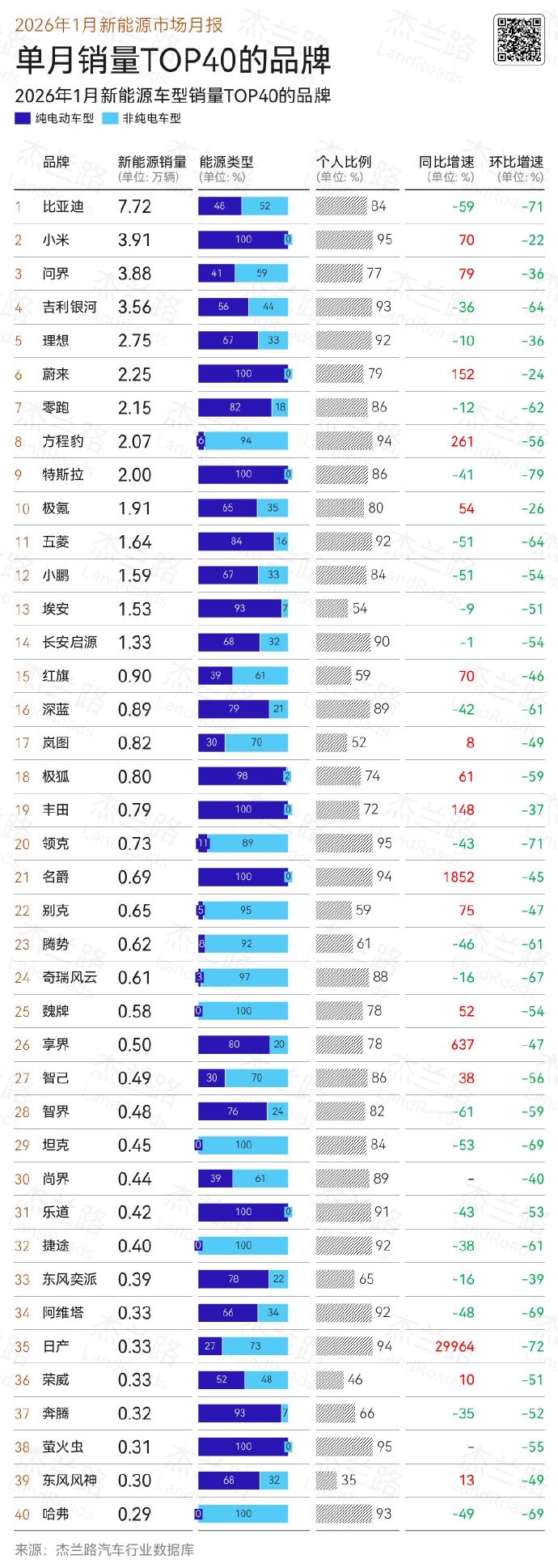 2026年1月,国内新能源乘用车市场受春节假期与季节性因素影响,整体销量56.3万辆,同比-20%、环比-58%,渗透率回落至36.3%。