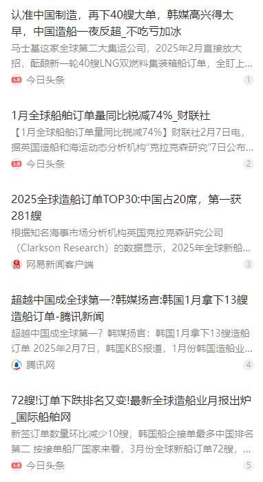 40艘大单直接砸向中国,韩国造船业拿到了全球62%的订单,韩媒马上狂欢,还扬言“重夺第一”,结果得意劲儿还没捂热,就被泼了盆冷水。 麻烦看官老爷们右上角点击一下“关注”,既方便您进行讨论和分享,又能给您带来不一样的参与感,感谢您的支持! 2025 年开年,全球造船市场上演了一场先扬后抑的反转戏码。韩国造船业凭借单月亮眼数据高调宣布重夺全球第一,国内舆论一片狂欢。 可这份得意没持续多久,一盆来自中国的冷水就当头泼下。全球航运巨头直接把 40 艘超大型船舶订单全部砸向中国船厂,用真金白银给这场短暂的狂欢画上句号。 英国克拉克森研究在 2025 年 2 月初发布的统计显示,当年 1 月全球新船订单总量为 146 万修正总吨。其中韩国船企拿下 90 万修正总吨,占比高达 62%,在当月市场中一马当先。 这组数据立刻点燃韩国舆论,多家主流媒体争相报道,纷纷用 “重返王座”“重新领跑” 等标题造势,认为韩国造船业已经扭转局面,正式超越中国重回世界第一。 在韩国媒体的密集宣传下,整个行业都被带动起来,业内人士纷纷表态,对未来市场充满信心,甚至放出长期保持领先的豪言。 可明眼人都能看出,这份成绩存在明显的时间特殊性。2025 年 1 月恰逢中国传统春节,国内船厂普遍进入假期节奏,接单与签约节奏自然放缓。 即便在这样的不利条件下,中国船企当月仍交付 21 艘船舶,在船舶数量上保持优势。所谓韩国反超,不过是假期带来的短期现象,并非真实实力反转。 就在韩国沉浸在单月胜利的喜悦中时,全球航运界的重磅消息突然传来。丹麦马士基集团正式敲定一笔超级订单,将 40 艘 LNG 双燃料集装箱船全部交给中国船厂建造。 这批船舶属于高端绿色智能船型,技术要求高、建造难度大,总金额超过 80 亿美元。如此大体量、高规格的订单,直接选择中国而放弃韩国,给韩国造船业沉重一击。 马士基作为全球顶尖航运企业,向来以严苛标准选择合作伙伴。此次大手笔投向中国,既是对中国造船技术的认可,也是对产业链稳定性与交付能力的信任。 消息公布后,韩国业内的兴奋情绪迅速降温,之前的高调表态变得安静不少,所谓重夺第一的底气,瞬间被现实戳破。 从更长周期的数据来看,中韩造船业的差距并非单月能够扭转。截至 2025 年 12 月底,中国造船业手持订单达到 27442 万载重吨,占全球总量的 66.8%。 同期韩国手持订单占比仅为 24% 左右,两者差距悬殊。中国手持订单规模不仅遥遥领先,生产排期已安排至数年之后,行业根基极为稳固。 这种差距不是偶然,而是长期积累形成的格局。中国拥有全球最完整的造船产业链,从钢材、核心部件到总装建造,全流程自主可控,成本与效率优势明显。 在绿色转型浪潮下,中国船企提前布局 LNG 双燃料、氨燃料、甲醇燃料等低碳船型,技术成熟度与市场占有率快速提升,成为全球船东首选。 智能化改造同样走在前列,数字设计、智能车间、精准管理全面普及,大幅提升建造质量与交付周期,在国际竞争中形成难以复制的优势。 2025 年全年数据印证了这一领先地位。工信部发布的官方数据显示,中国造船业三大指标 —— 完工量、新接订单量、手持订单量,继续保持全球第一。 这也是中国自 2010 年以来,连续 16 年在三大指标上领跑全球,彻底巩固世界第一造船大国的地位,绝非短期波动可以撼动。 相比之下,韩国虽然在高端 LNG 船等细分领域保持优势,但整体市场份额与订单规模难以追赶中国。单月领先更像是特殊节点的昙花一现,无法改变长期格局。 马士基订单的流向,恰恰说明全球市场对中国造船实力的认可。高端船型、大额订单持续流向中国,正在成为行业新常态。 韩国想要依靠个别月份的数据反弹实现反超,既不现实也不符合产业规律。真正的竞争比拼的是技术、产业链、交付能力与长期稳定性。 2025 年的这场小插曲,清晰展现出全球造船业的真实格局。短期起伏改变不了长期趋势,短暂领先代替不了整体实力。 中国造船业凭借完整产业体系、持续技术创新与稳定交付能力,牢牢占据行业顶端。韩国的短暂狂欢,更像是对现实差距的不甘与情绪宣泄。 随着绿色航运加速推进,全球新船需求向低碳、智能、大型化集中,中国船企的优势还将进一步扩大。未来行业竞争,只会朝着更有利于中国的方向发展。 从单月数据的虚假繁荣,到超级订单的实力打脸,再到全年指标的绝对领先,2025 年造船市场的起伏,让世界看清谁才是真正的领跑者。