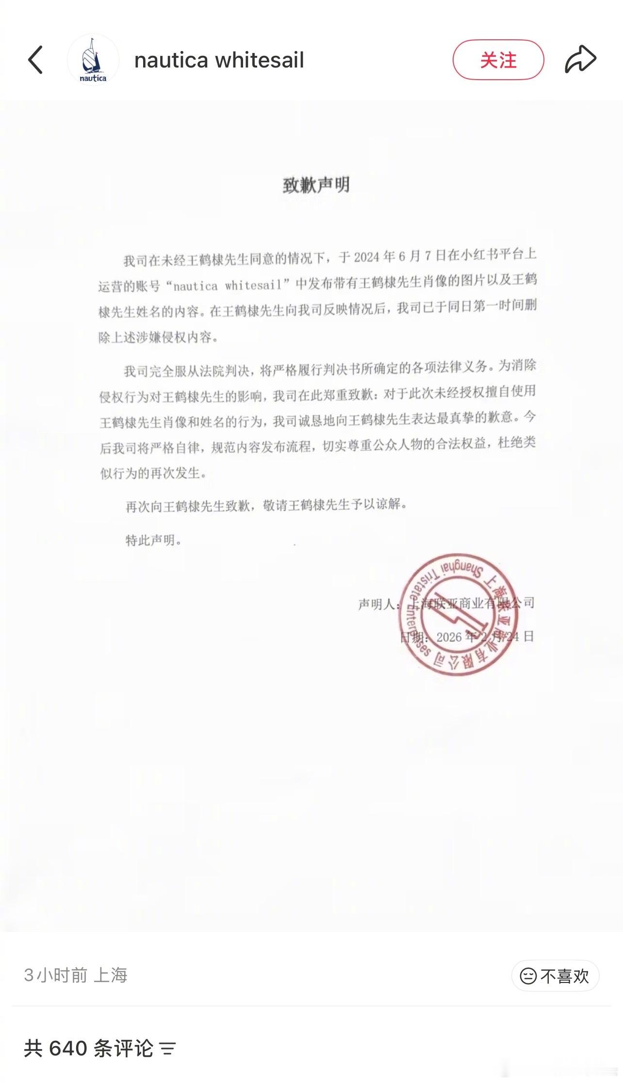 王鹤棣把品牌方告了,原因是品牌方在没有商务合作的情况下私自认领王鹤棣的私服且用于推广。别人可以穿,但你不能一次次免费拿人家去打广告,明星商业价值还是很高的,对人家那些花了钱请代言人的商家不公平,换谁都得告你。