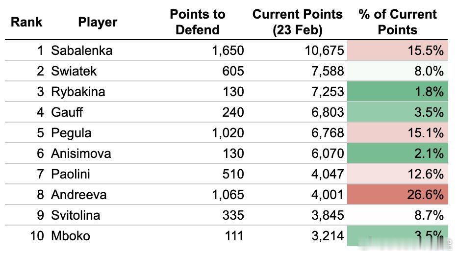TOP10在阳光双赛(还有梅里达、奥斯汀)的保分压力:萨巴伦卡、安德列娃、佩古拉压力大姆博科、阿尼西莫娃、莱巴金娜没压力