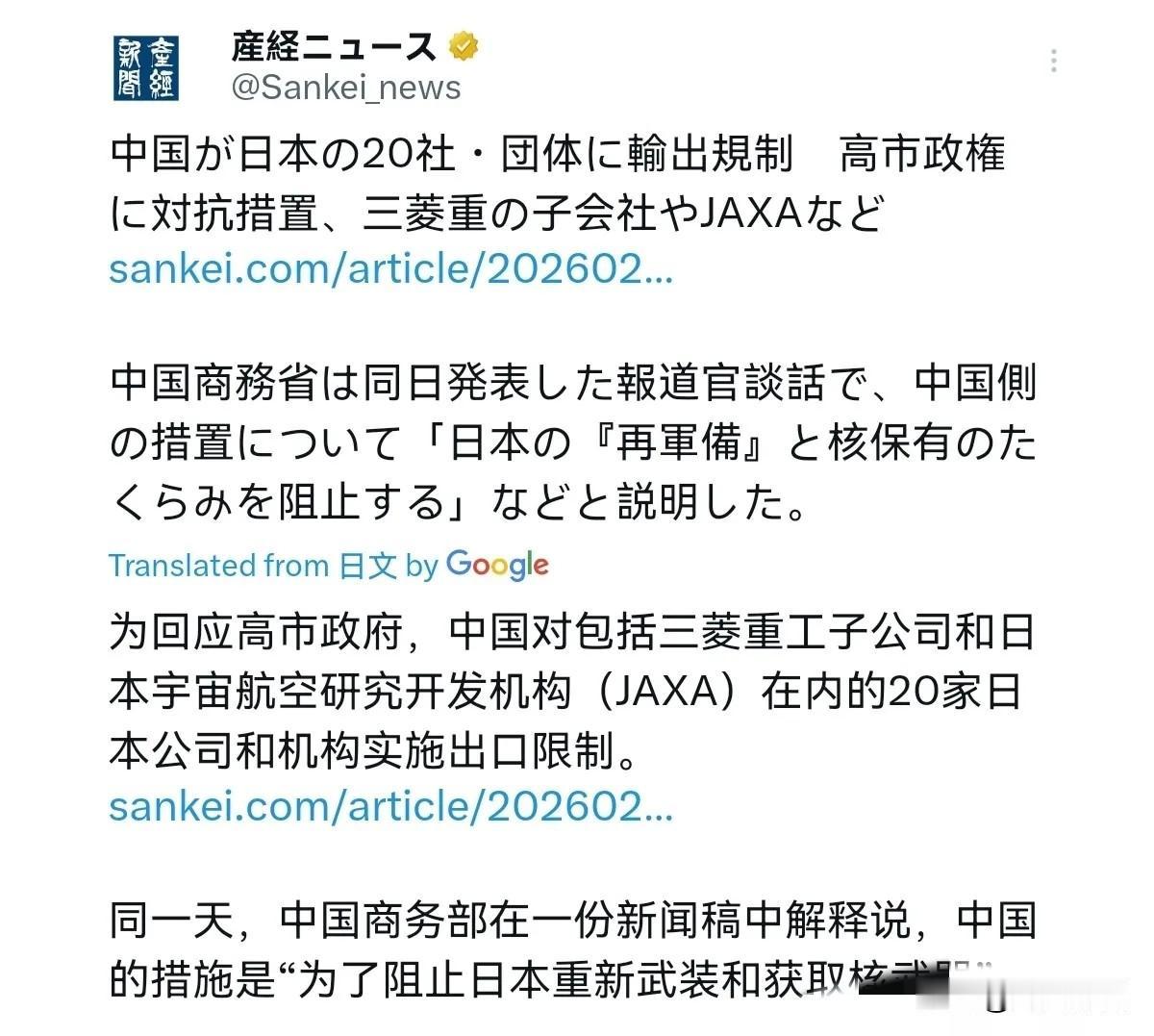 中国再次对日本出手!开年上班第一天,日本没有等待我们对其希望对话的回应,而是等到了新的制裁令!2月24日,根据日本产经新闻报道,日媒称,中国商务部宣布将20家日本企业和机构列入出口管制清单,禁止出口军民两用产品。清单中的企业包括三菱重工集团公司、日本防卫大学和日本宇宙航空研究开发机构。而这一禁令宣布后即刻生效。 评几句: 对话没等来,反制先到位!中国对20家日本实体出手 2月24日,中国商务部宣布,将三菱重工、日本防卫大学等20家涉军实体列入出口管制清单,相关军民两用产品禁令立即生效。开年第一记反制,清晰有力、直击要害。 日本一边表态希望对话,一边不断推进涉军事相关动作,中方此次管制,针对的是少数涉军实体,并非正常经贸合作,完全合理合法、有理有据。 从军工企业到防卫相关机构,这批被限制的实体,都与日本防卫建设密切相关。中国依法采取措施,既是维护自身安全,也是对地区和平稳定的必要守护。 行动比口号更有说服力,反制更显态度。中国坚持对话,但绝不接受一边谈一边采取不利行动。任何危害国家利益的行为,都必然付出代价。 面对挑战,中国态度明确:不惹事,也绝不怕事,该出手时就出手!