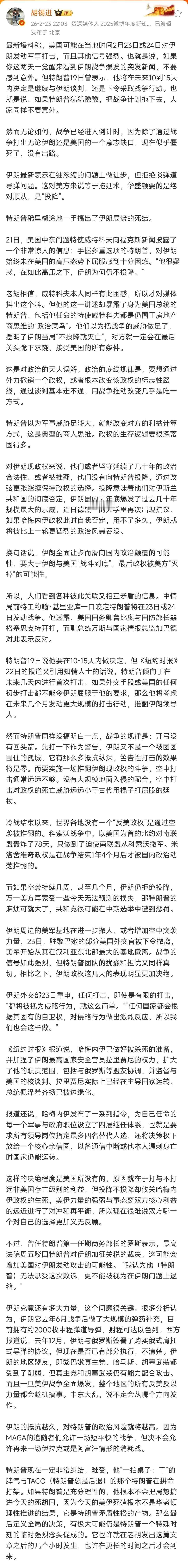 坐看胡锡进出笑话。 胡锡进昨天发长文称,美国可能在当地时间23日或24日对伊朗动手。虽然他引用的是外媒的消息,但是接下来他用了很长的篇幅分析此事发生的可能性。最后得出的结论是“(美国对伊朗开战)也许就在老胡发出这篇文章之后的几个小时发生,也许在更长的时间之后才会到来”。 现在已经是24日下午了,就算他按美国时间算,也是24号凌晨了。再过20来个小时战事还不爆发的话,胡锡进又闹了个大笑话。他以为自己当过一段时间的战地记者,就俨然是个军事家了!就连这样重大的事情都能手拿把掐! 就算他给自己留了条后路,但是从他这篇文章可以看得出来,他非常希望美国马上就动伊朗动手。也不知道伊朗是什么地方把胡锡进给得罪他,他竟如此希望美国打击伊朗。