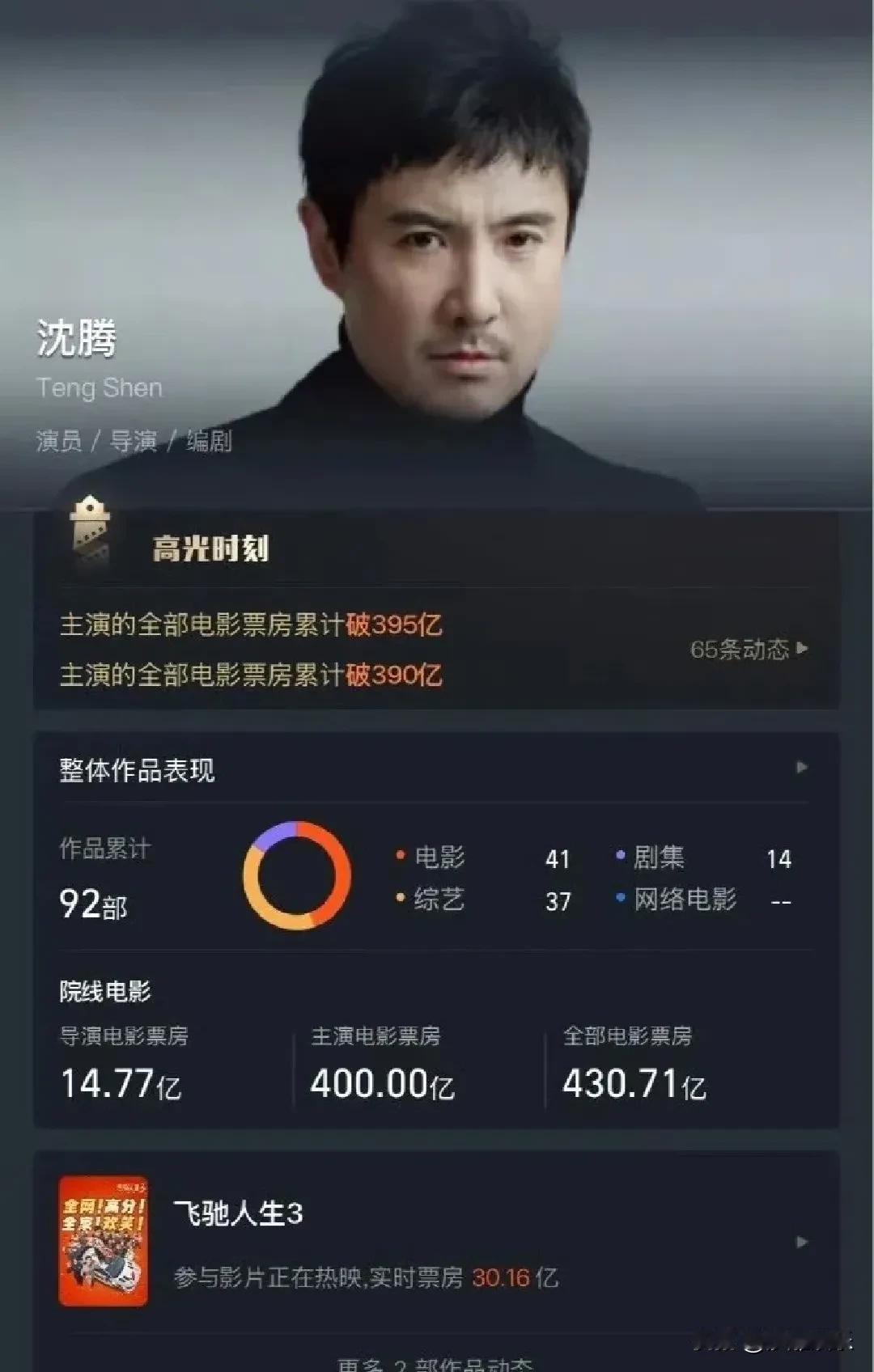 沈腾,正式登顶! 2月24日,沈腾正式成为中国首个主演票房破400亿的演员 。说真的,刚看到这数字我愣了一下,400亿,这得是多少张电影票摞起来的高度? 但转念一想,这不就是我们这帮观众,过年过节习惯性买张票,去电影院跟着“长在笑点上”的沈叔叔乐呵俩小时,慢慢攒出来的吗?从当年的“郝建”到现在的400亿先生,沈腾最厉害的不是他能扛票房,而是他让大伙儿觉得,花那几十块钱进电影院,起码能真乐呵,不肉疼 。 现在大家看电影都精着呢,什么“含腾量”成了硬通货 。这哪是算票房啊,这分明是咱们普通人对“开心”这俩字,最实诚的一次投票。这400亿,是沈腾的,也是咱们每一个想在生活中找点乐子的普通人的。 恭喜,沈腾!
