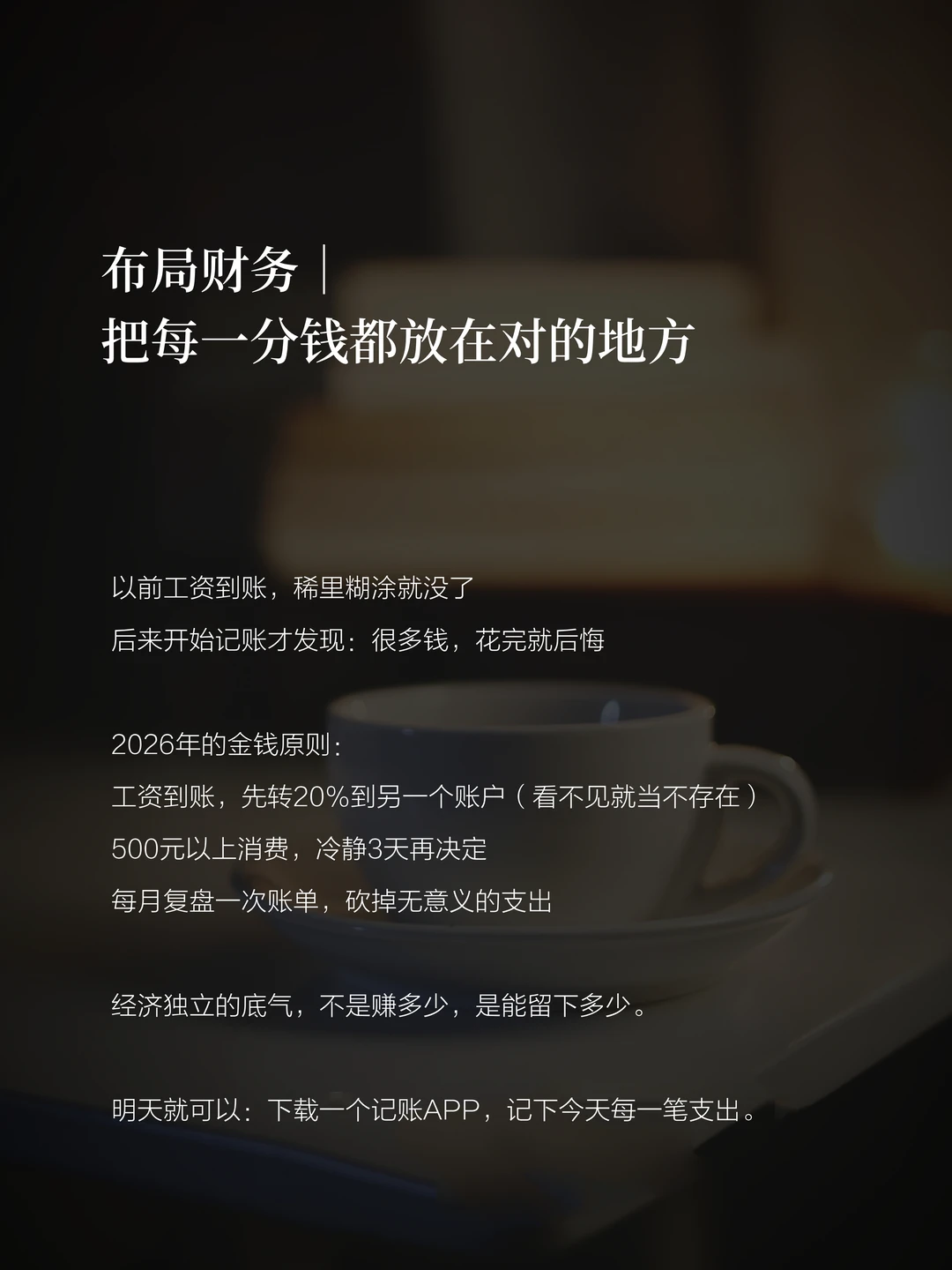 ▪️ 财务:先存20%|500元冷静3天|每月复盘