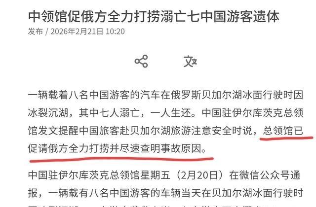 中国对俄罗斯施加压力了!俄罗斯对此事要认真处理!2月21日,在发生一辆载着八名中国游客的汽车在俄罗斯贝加尔湖冰面行驶时因冰裂沉湖 奥尔洪岛附近霍博伊角,水深18米,车辆是当地常见的UAZ越野车,载着1名俄罗斯司机和8名中国游客,总共9个人。车上游客都是自助游,没通过正规旅行社,直接联系当地人接单。这条路线也没经过官方批准,属于私人运营。遇难的7名中国游客里,有一对夫妇带着14岁孩子和一名女性亲属。唯一生还的中国游客在车沉没前最后一刻被拉上冰面,身体状况稳定,已和家属联系上。司机本人也没能脱身。 事故发生后,俄罗斯紧急情况部马上派救援队,用水下摄像头定位车辆位置,准备潜水员打捞遗体。伊尔库茨克州州长公开确认了情况,当地侦查委员会立案调查,罪名包括提供不符合安全要求的旅游服务导致两人以上死亡,以及玩忽职守。州政府要求对非法承运人进行专项检查,加强冰上旅游监管。 中国驻伊尔库茨克总领馆得知消息后,第一时间启动应急机制,紧急联系俄方,要求全力开展救援打捞工作,并尽快查明事故原因。总领馆派领事官员赶到现场,协调当地志愿者一起协助处理善后事务。这一系列动作,清楚表明中方对遇难者家属负责的态度,也是在督促俄方优先组织力量把遗体打捞上来,给出一个负责任的交代。 这次事故性质挺严重,贝加尔湖冬天游客越来越多,尤其是中国游客,去年数量翻了一倍,达到14.6万人次。大家去主要是看蓝冰和自然景观,可今年气候异常,气温回升快,冰层比往年薄,很多地方肉眼就能看到裂痕。1月28日就发生过一起中国游客冰面翻车事故,已经死了一人。这次又是私人车辆走未开放路线,风险摆在那儿。俄方旅行协会也指出,这些游客没走正规团,直接找当地居民,管理上存在明显漏洞。 总领馆随后发布安全提醒,强调官方冰道开放前,严禁任何车辆上冰,建议大家选气垫船出行,坚决不坐无资质的黑车。生命安全摆在第一位,这话谁都懂。中方这样表态,就是希望俄方把内部管理堵严实。违规运营、操作责任都要彻查,相关人员该处理的处理。只有这样,中俄旅游合作才能稳下来,避免类似事再发生。 俄罗斯那边已经启动刑事程序,重点核查安全服务是否达标。救援打捞工作按计划推进,遗体核实身份后会妥善移交。整个过程双方都在跟进善后。说到底,旅游是双方都想做好的事,但安全出问题,游客就不敢来了。俄方如果能认真吸取教训,把冰上路线审批、车辆资质、天气监测这些环节管起来,以后大家去玩才更放心。 出境游不能只图便宜或灵活,自助找当地人接单看着省钱,其实隐患大。正规旅行社有保险、有备案,遇到事处理流程也清楚。贝加尔湖这么有名的地方,游客越来越多,管理跟不上就容易出事。希望俄方这次调查结果公开透明,给遇难家属一个实实在在的说法,也给其他游客一个交代。