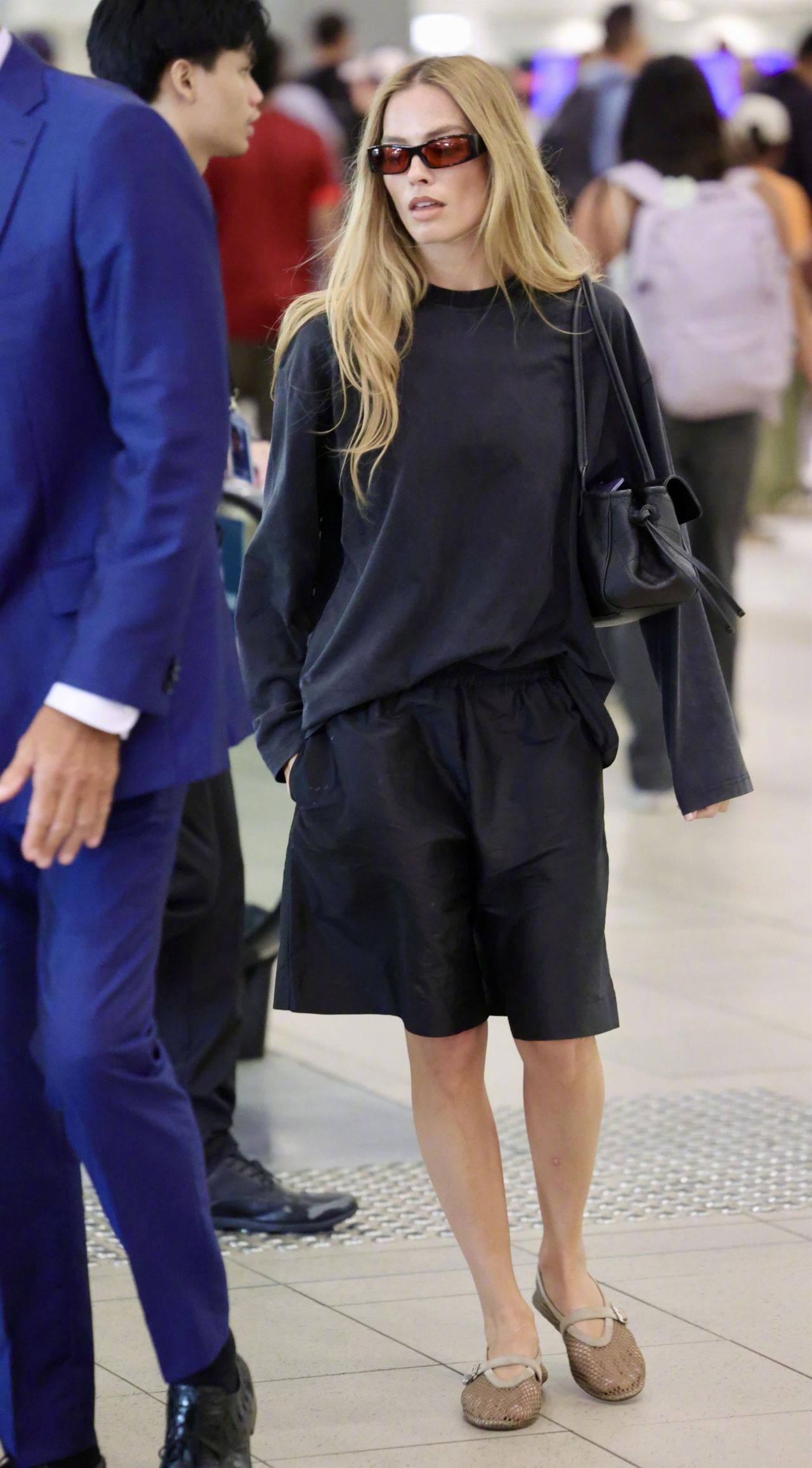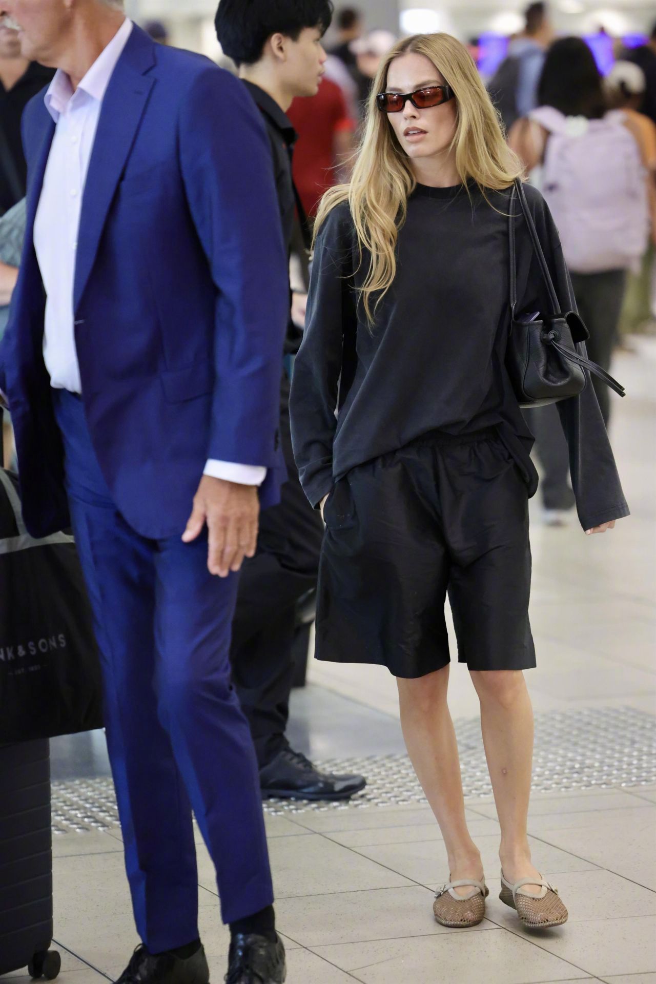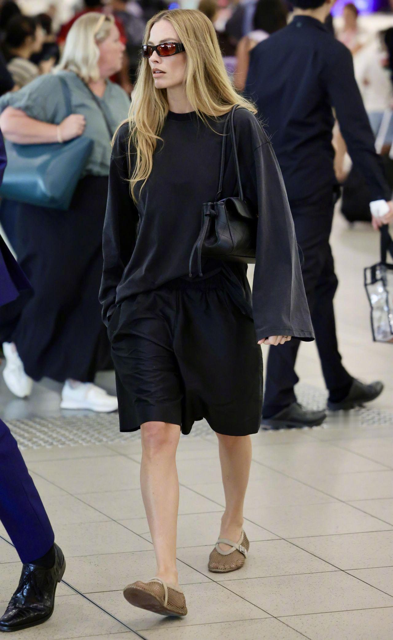 现身悉尼机场的玛格特·罗比。一身黑色系飞机装,简约不失时髦,看似不刻意的打扮,但却尽显精致。身穿的是澳洲设计师品牌Beare Park 圆领长袖T恤和同品牌真丝短裤,脚穿Alaia 渔网芭蕾平底鞋,肩背CHANEL 2026春夏系列包包,佩戴香奈儿 Coco Crush 戒指和SIR墨镜🕶️。米拉服饰解析