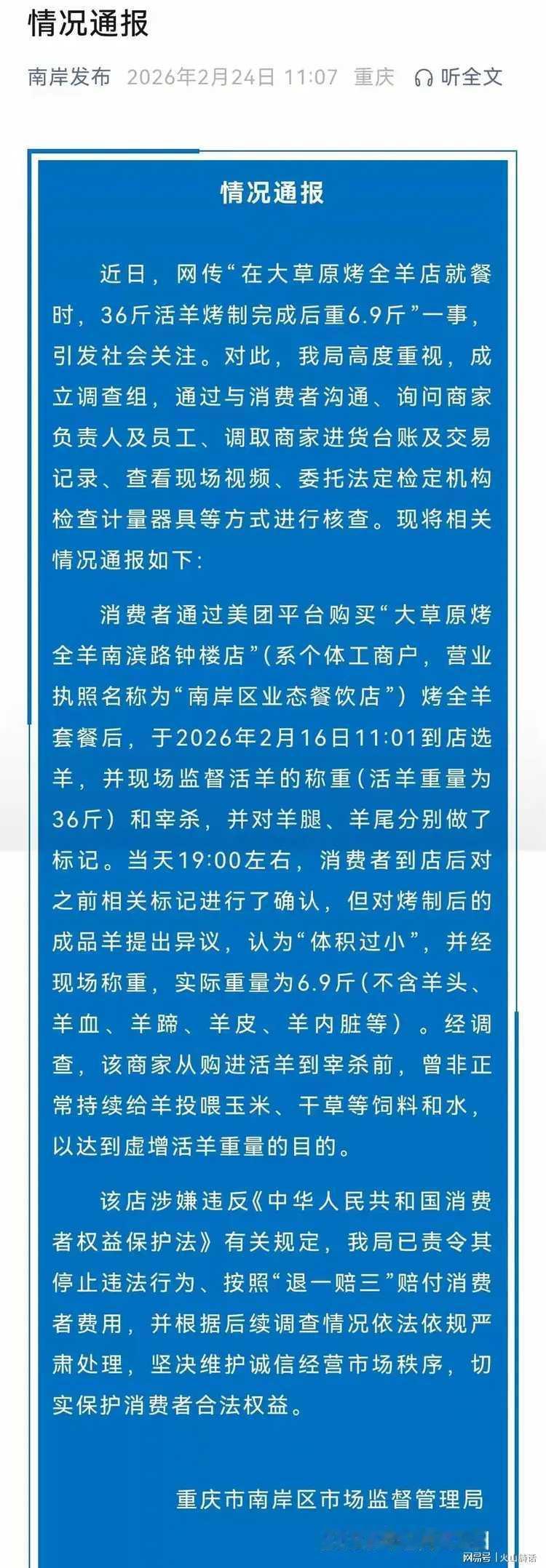 商家退一赔三! 这次那短斤缺两的商家可算是赔了夫人又折兵。 当然,只给了这个黑商家只是撞上了一个爱较真的食客。之前他骗了多少食客,应该不会少,要不然,他也不会这样大胆。 生羊肉烤熟损耗大约在百分之三十,应该还有11.9斤。而这个黑心商家却只给了6.9斤,还有将近一半继续牟利。 像这种黑心商家应该取缔其经营权。因为他绝不可能是第一次这样做。 在市场上经常会发生缺斤少两情况,就是因为监管不到位,处罚有漏洞。加之一些商家也只敢少少的缺斤少两,像他这种11斤肉少了5斤的,还是比较少见。