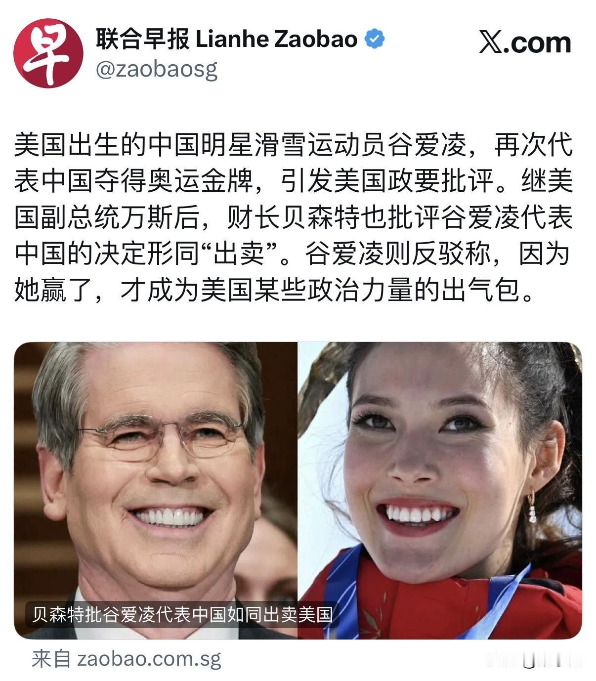 联合早报今天报道:“美国出生的中国明星滑雪运动员谷爱凌,再次代表中国夺得奥运金牌,引发美国政要批评。继美国副总统万斯后,财长贝森特也批评谷爱凌代表中国的决定形同“出卖”。谷爱凌则反驳称,因为她赢了,才成为美国某些政治力量的出气包。” 评几句:美国两位高官接连点名批评谷爱凌,本质就是输不起的政治双标。谷爱凌的反驳,直接戳破了美国当下最真实的一面:只许自己赢,不许别人赢;只许人才流向美国,不许人才选择中国。明明是纯粹的体育竞技、个人职业选择,却被强行绑上意识形态战车,两位高层轮番攻击一个运动员,既小气又失态,把美式双标和输不起的心态暴露得一览无余。说到底,他们攻击的不是谷爱凌,而是中国对全球人才的吸引力。