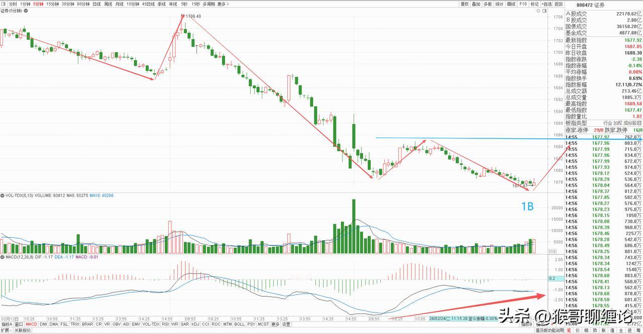 券商板块今天高开低走,收了一根缩量小阴线,早盘做了一个小幅高开的动作,开盘便快速走低,一度接近翻绿,虽然后面再度反抽,但力度并不理想,上攻无力那就只能继续下行,所以整个下午就是持续走低的过程,在大盘强势的局面下,不仅没有锦上添花,反而还在拖后腿,非常让人失望。但事出反常必有妖,明天才是真正检验走势的时候,就看能否让人眼前一亮。 从5分钟图上看,收盘已经出现强有力的背驰买点,明天就看这笔买点拉升的力度,只要快速突破今日高点,那再回调下来就有机会构建二买,就能结束这笔短线回调,开始30分钟级别的上涨。券商