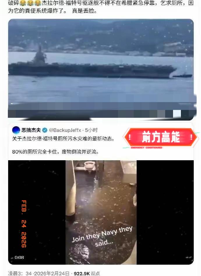 好家伙,一船的屎尿横流,这画面不敢想象,不忍直视。 破碎杰拉尔德·福特号航母不得不在希腊紧急停靠,乞求厕所,因为它的粪便系统爆炸了。 关于杰拉尔德·福特号厕所污水灾难的最新动态:80%的厕所完全卡住,废物倒流并逆流。 造价上千亿的顶级核动力航母,没被对手难住,反倒被马桶彻底干趴,说出去都让人笑掉大牙。号称全球最强的海上巨兽,连最基础的排污系统都搞不定,还谈什么威慑力,简直是大型翻车现场。 高科技堆得再多,基础保障拉胯照样没用,这波操作直接把所谓的先进光环摔得稀碎。几千名舰员在臭气里排队等厕所,连基本生活都成问题,战斗力更是无从谈起。 花大价钱搞面子工程,里子却一塌糊涂,这样的“最强”实在太讽刺。你觉得这是意外,还是装备管理本身就有问题?