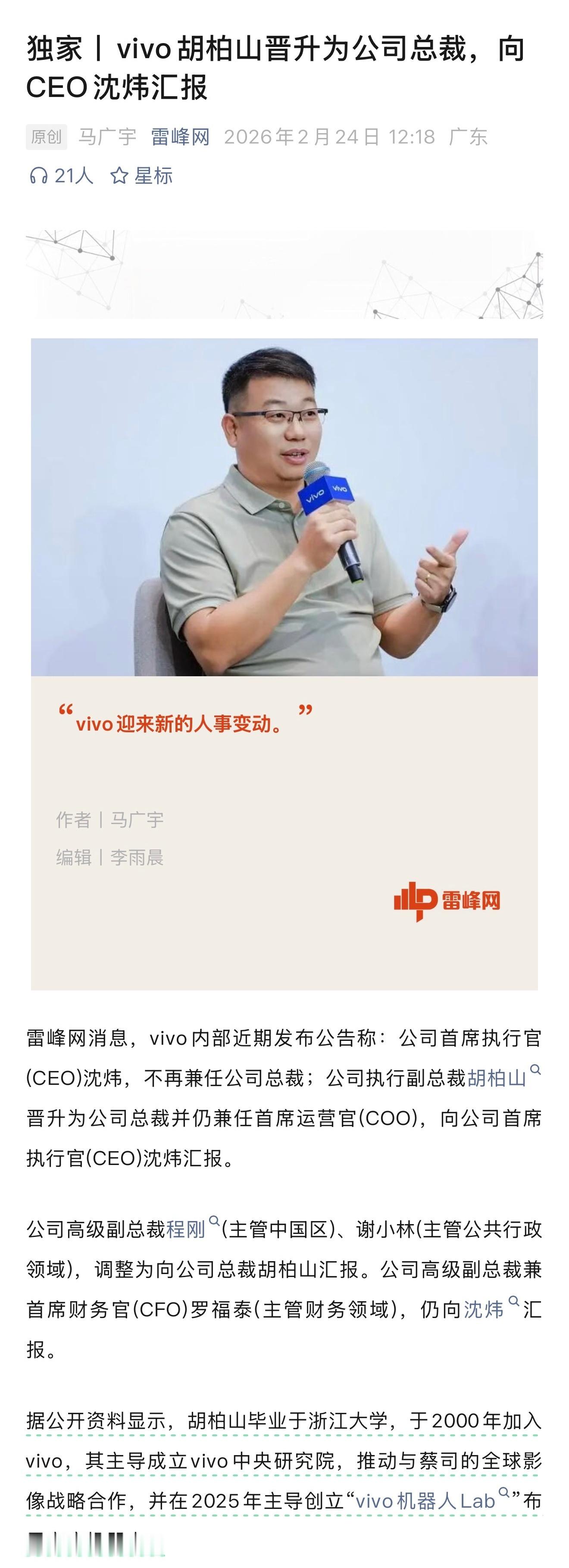 雷峰网消息,vivo内部近期发布公告称:公司首席执行官(CEO)沈炜,不再兼任公司总裁;公司执行副总裁胡柏山晋升为公司总裁并仍兼任首席运营官(COO),向公司首席执行官(CEO)沈炜汇报。