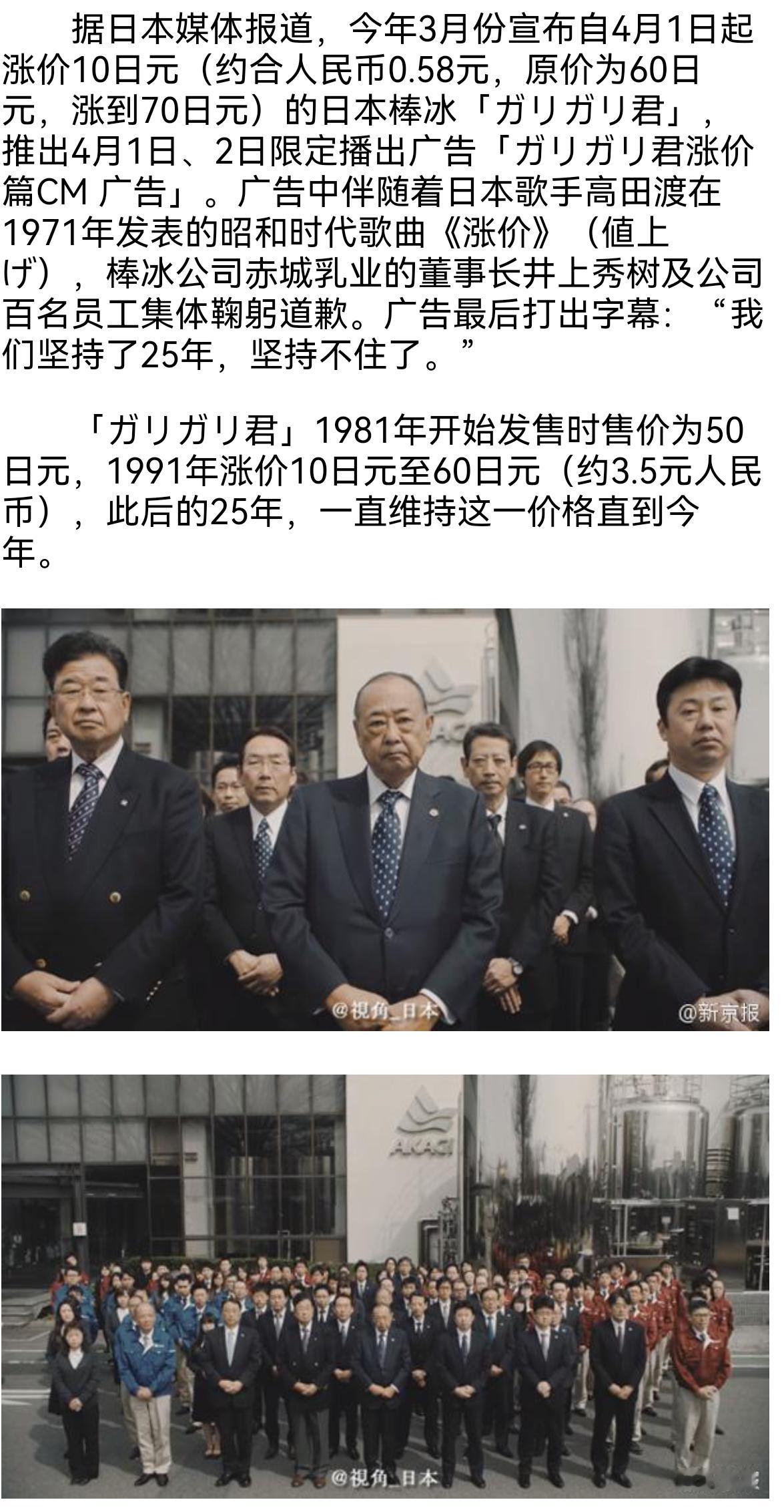 去年国内新闻各种报道一则鸡汤:“日本一冰棒厂商25年不涨价,涨价6毛钱后全体鞠躬道歉,尽显人文与坚守”
