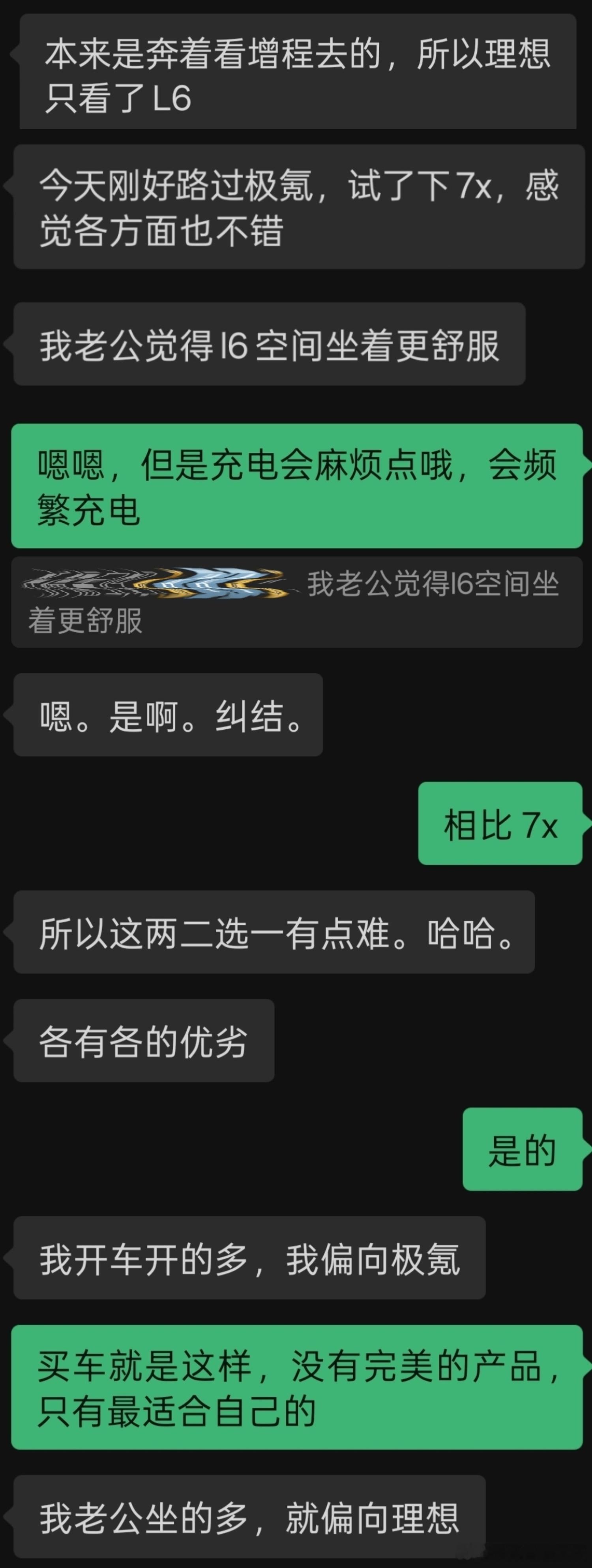 这么一听,我觉得她家更适合纯电车型,于是跟她提了理想i6,跟极氪7X一样都很有性价比。